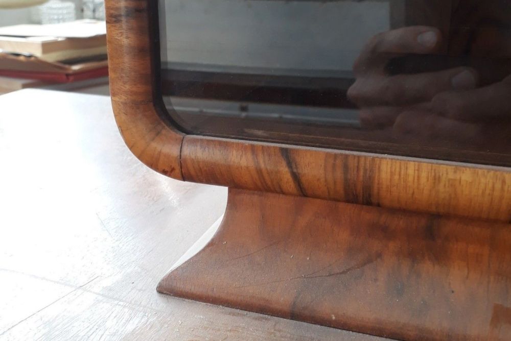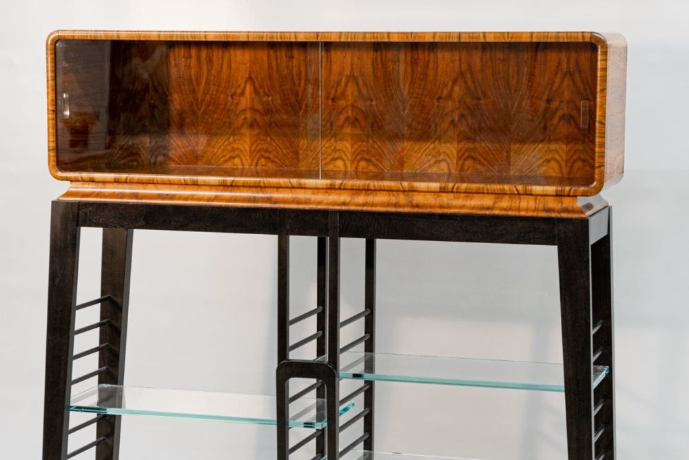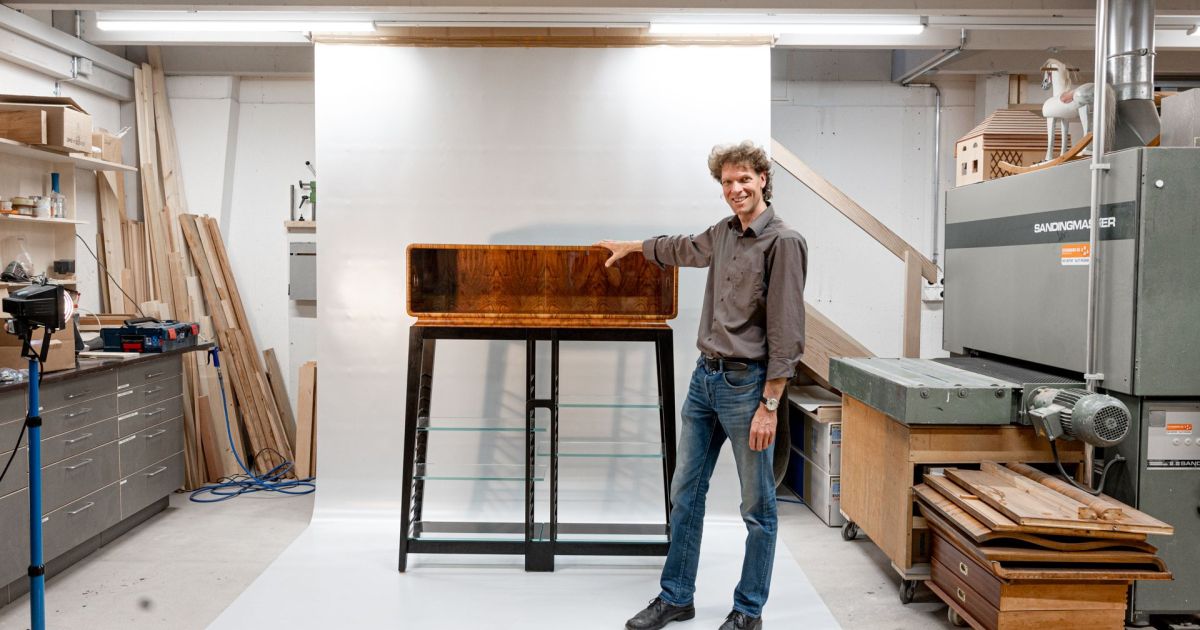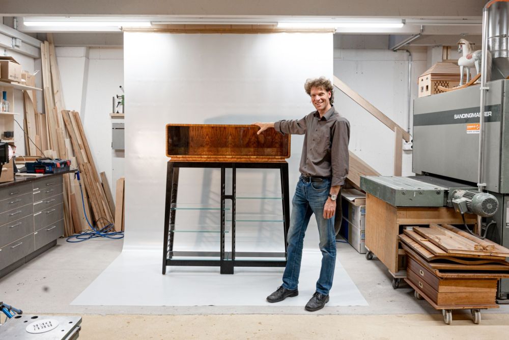 Florian Hunziker mit der umgestalteten Art-Deco-Vitrine. Bild: Moebelpunktanders