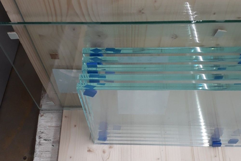 Dadurch, dass sich das Möbel gegen oben verjüngt, und alle Glastablare für eine Möbelhälfte gleichlang gebaut sind, überlappen sich deren Kanten in der Mittelpartie. Das ist eine Spielerei. Beim schwarz lackierten Ständer fällt ein zentral platziertes Zierelement auf, welches die abgerundete Form der historischen Korpus-Eckverbindung aufnimmt.