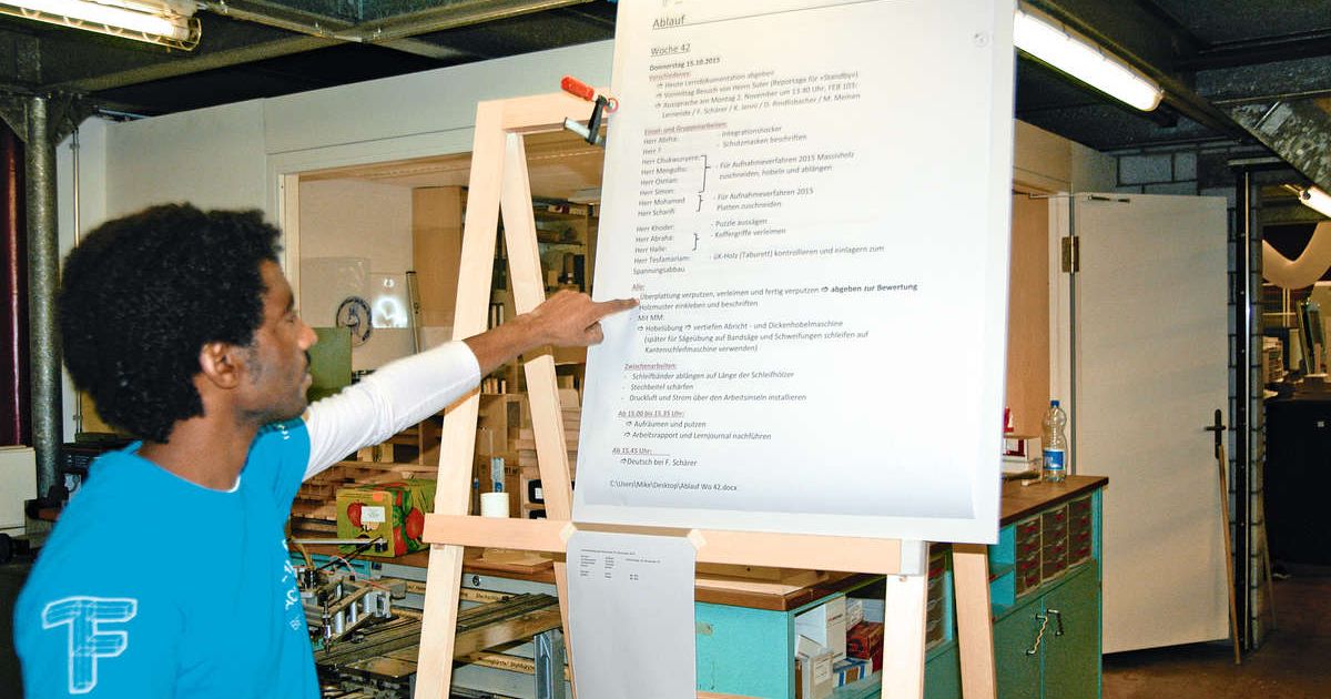 In der Grundausbildung zum Schreinerpraktiker lernen die Flüchtlinge, mit unterschiedlichen Werkzeugen und Materialien umzugehen. Neben vier Tagen praktischer Arbeit drücken die Teilnehmer an einem Tag pro Woche die Schulbank und lernen zeichnen, rechnen, Berufskunde und Deutsch. Nach neun Monaten steht dann ein Jahrespraktikum mit einem Tag Berufsfachschule an, bevor sich die Flüchtlinge die restlichen drei Monate wieder an der TF Bern auf die Abschlussprüfung vorbereiten. Die Flüchtlinge sind sehr motiviert und haben Spass an der Arbeit.
