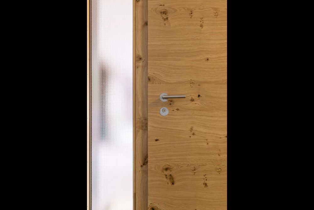 Für den Rahmen kam das Produkt «CombiModul EEO» in Eiche, beidseitig mit europäischem Ahorn furniert, zum Einsatz. Das verwendete Türblatt «ClimaTop Eco» mit Eicheneinleimer wurde ebenso beschichtet. Um die bei Aussentüren einzusetzenden Klimaklassen zu erreichen, kommt der Rohling ohne Metall- oder GFK-Verstärkungsprofile aus. «Diese können bei der Weiterverarbeitung – etwa bei der Bearbeitung für den Schlosskasten – immer wieder zu teuren Werkzeugschäden führen», weiss Eisele.