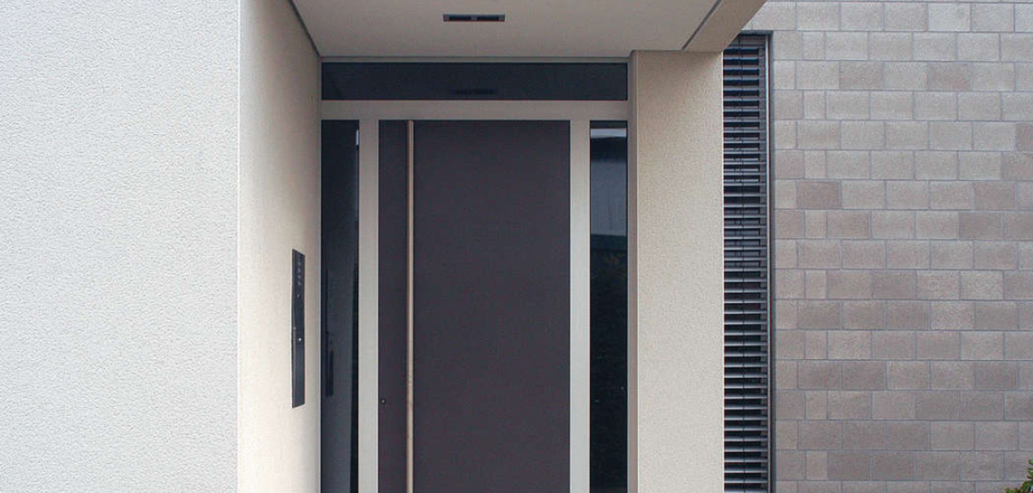 Bei den Referenzen der Schreiner und den Produzenten von Haustürrohlingen finden sich auch solche, bei denen der eher klassische Ansatz eines wirkungsvollen Eingangsportales auch mit Rohlingen, aber entsprechend dem Stand der Technik realisiert wurde. Je nach Bausituation kann man auch etwas mutiger entwerfen, etwa wenn sich innen an die Hauseingangstür ein nicht oder nur gering beheizter Windfang anschliesst. Durch die dort erhöhte relative Luftfeuchtigkeit verringert sich die Feuchtedifferenz vor allem in den Wintermonaten zwischen äusserer und innerer Türseite, was einen möglichen Verzug des Blattes verringert.