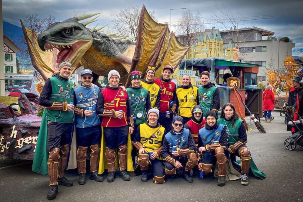 Pascal Odermatt (27, stehend, Dritter v. r.) ist aktiver Fasnächtler und Präsident der Wagenbaugruppe «Zwätschgeräuber» in Meggen LU. Bild: PD
