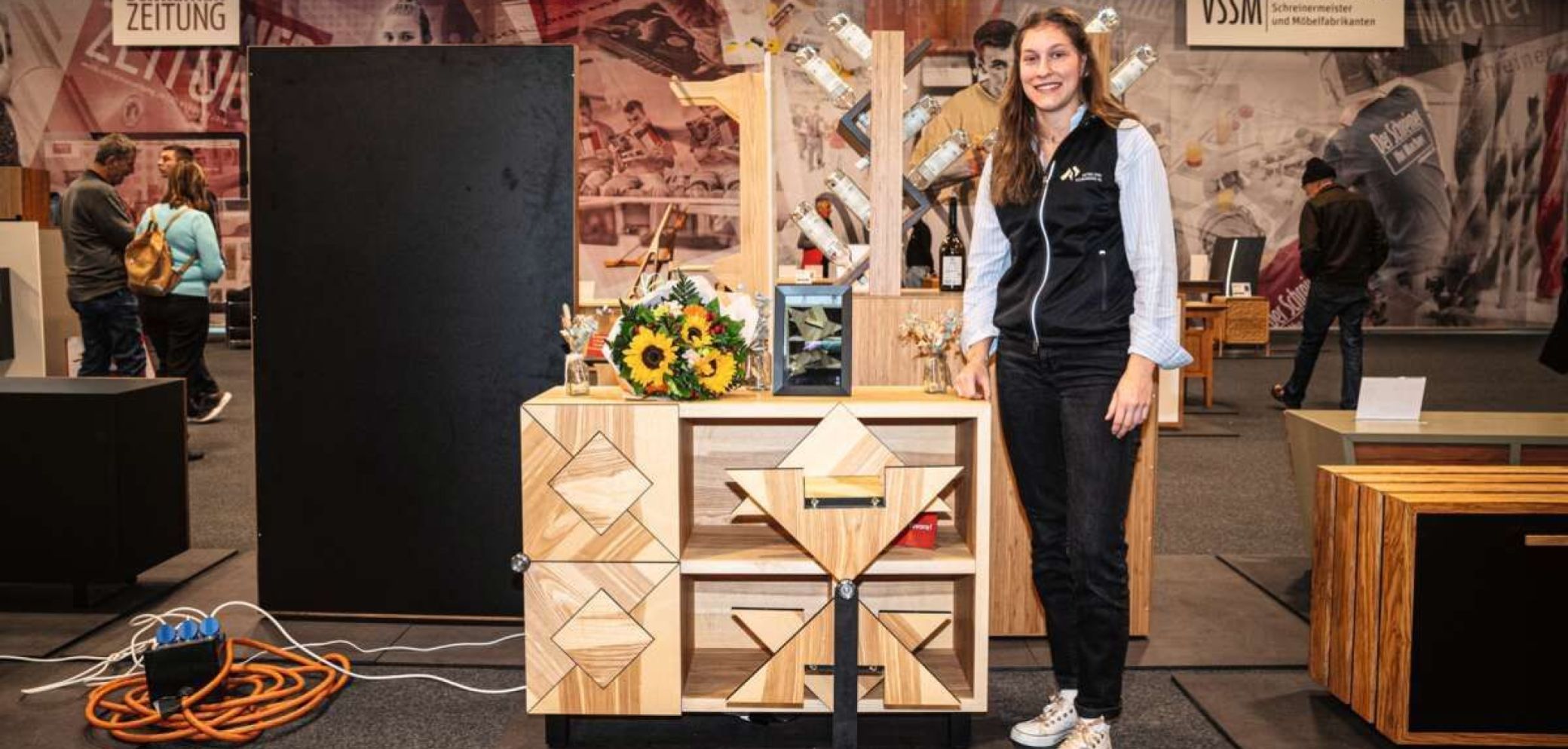 Nachwuchsstar. Das Publikum der Holz in Basel hat dem Möbel von Laura Frick aus Balzers FL die meisten Stimmen gegeben. Es fällt durch den besonderen Öffnungsmechanismus auf. Die 17-Jährige gewinnt 2500 Franken und darf sich «Schreiner Nachwuchsstar 2025» nennen.