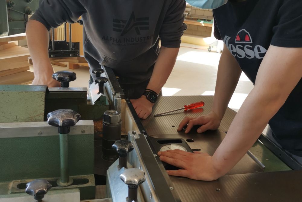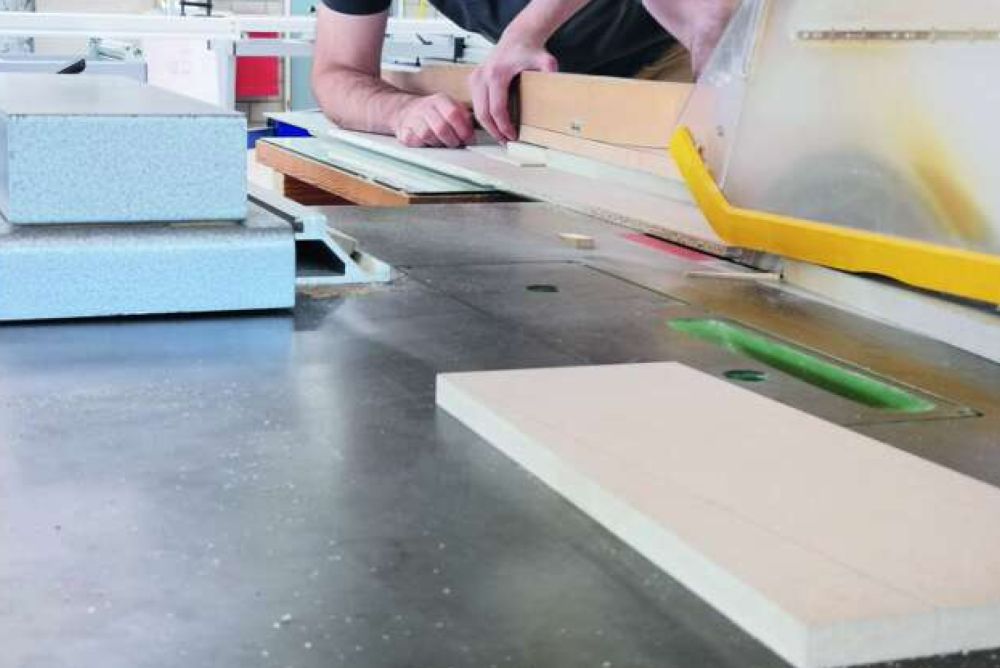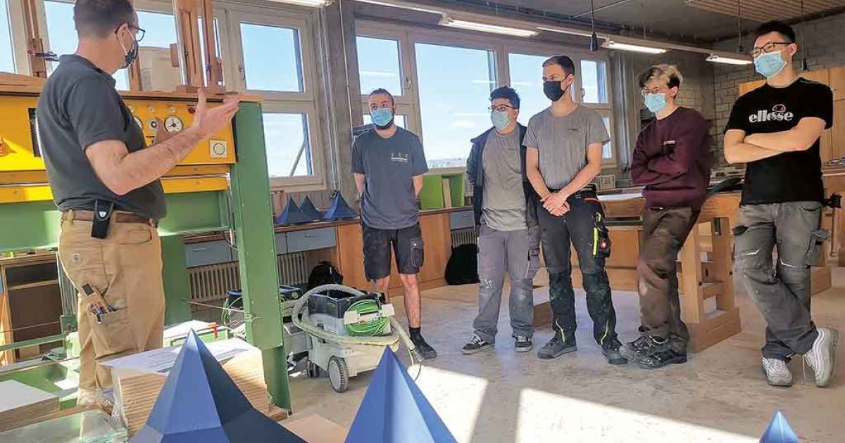 «Die Experten werden euch keine Fallen stellen, doch etwas überlegen müsst ihr schon selber.» Martin Herzig ist Leiter der überbetrieblichen Kurse (ÜK) im Ausbildungszentrum Schreiner Ober-ohringen (AZO) bei Winterthur ZH. Er erklärt acht Lernenden gerade, wie die Furnierpresse funktioniert. Es ist der zweite Tag des regional angebotenen Repetitionskurses vor der Teilprüfung, die im zweiten Semester des dritten Lehrjahres ansteht. Diese ist der erste Brocken im Qualifikationsverfahren, zählt 20 Prozent der Abschlussnote und ist zugleich eine Fallnote. Dementsprechend haben die Lernenden einigen Respekt davor. Abgefragt werden allgemeine Schreinerarbeiten wie Reissen, Verleimen oder Verputzen. Dazu kommen Arbeiten von Hand sowie mit den handgeführten und stationären Maschinen. Insgesamt gibt es elf Aufgaben, für jede stehen 60 Minuten zur Verfügung. Das Reissen wird separat geprüft, der Rest wird auf eineinhalb Tage verteilt.