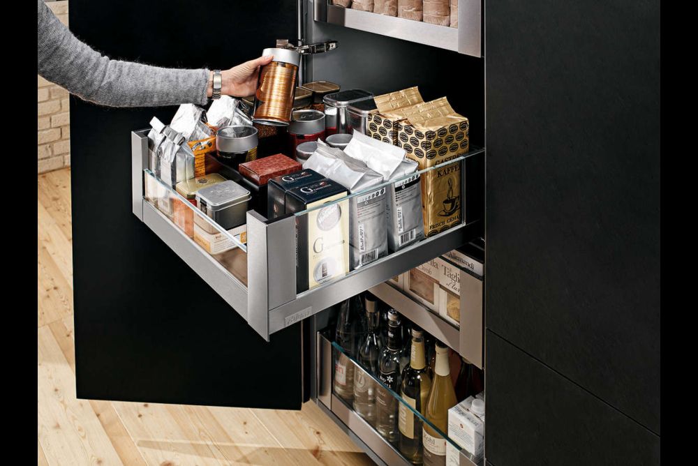 Beim «Space Tower»-Vorratsschrank von Blum ist dank Vollauszug stets guter Einblick und direkter Zugriff auf den Inhalt möglich – und zwar von drei Seiten und von oben. Auch die Entnahme von hohen Gegenständen, zum Beispiel Flaschen, geht durch die Entnahmemöglichkeit von oben leichter von der Hand. Es muss nicht immer das gesamte Gewicht des Schrankinhalts bewegt werden, um ein bestimmtes Füllgut zu entnehmen, sondern nur der gewünschte Auszug. Bis zu 55 % mehr Stauraum schaffen auch höhere Seitenwände.