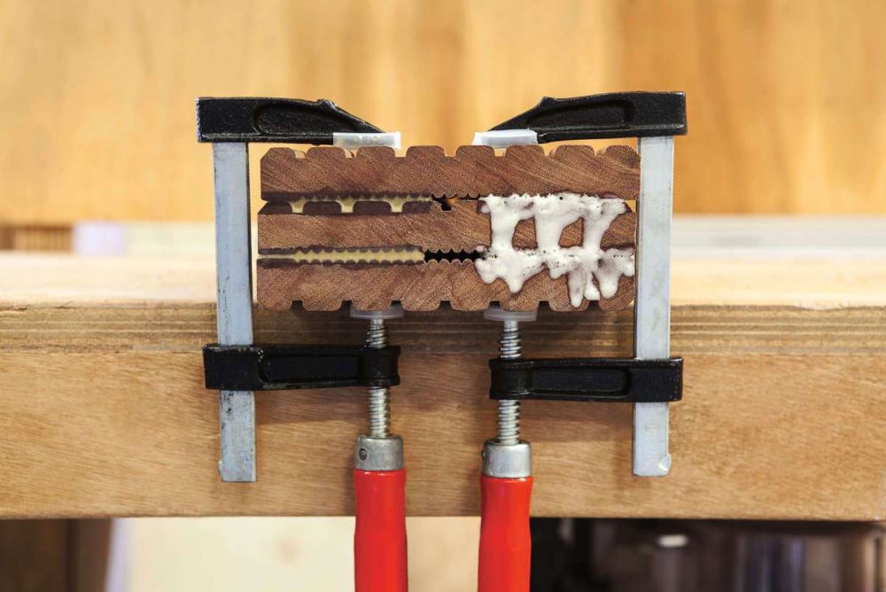 Hilfe bietet das saubere Abdecken neben den Leimfugen mit Paketklebeband, was allerdings sehr viel Zeit kostet. Wirklich interessant sind PU-Leime, die nur ganz wenig aufschäumen. Diese lassen dann auch komplexere Verleimungen zu. So gibt es spezielle Leime, die Lücken überbrücken können und wirklich halten, und auch solche, die selbst für Gartenmöbel eingesetzt werden können – was überhaupt nicht für alle diese Leime gilt.