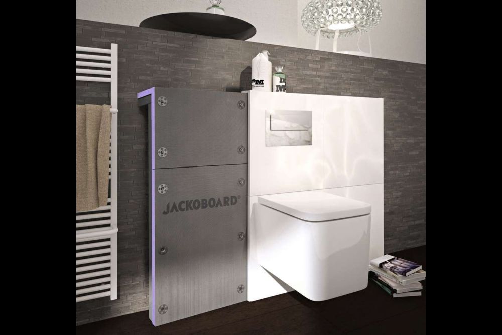 Wer Badezimmer auskleidet, braucht auch ein gutes Vorwandsystem für Hänge-WCs. Das «Jackoboard Sabo»-Montage-Set von Jackon Insulation ist für Räume mit hoher Feuchtigkeitsbeanspruchung ideal geeignet und besteht aus zwei Elementen mit vorgebohrten Löchern für die WC-Anschlüsse – passend und universell einsetzbar für alle gängigen Wand-WCs. Der Verarbeiter muss auf diese Weise nicht erst umständlich Öffnungen für die Rohrleitungen und Gewindestangen herausschneiden, sondern legt direkt los, indem er die Seiten des ersten Elements rechts und links auf das passende Mass kürzt, gegebenenfalls auch in der Höhe. Danach kann er «Jackoboard Sabo» bereits auf den Stahlrahmen des Ständerwerks schrauben. Dazu kommen die zum Set gehörenden selbstschneidenden Bohrschrauben sowie die Dämmplattenteller zum Einsatz. Aus der zweiten Platte entsteht das noch fehlende Stück für die Frontverkleidung und die Deckplatte. So wird, laut Hersteller, aus den beiden Elementen mit einer Gesamtfläche von 1300 × 500 mm und einer Dicke von 20 mm im Handumdrehen die wasserabweisende Verkleidung für WC-Vorwandinstallationen.
