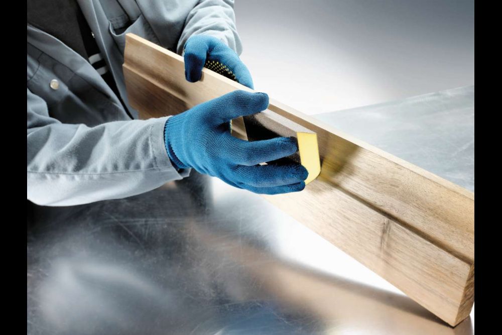 Gerade bei Kanten und Profilen, sowie den Übergängen von den Flächen dorthin, kommen Schleifmaschinen an ihre Grenzen, wenn es um gleichmässige Oberflächen geht. Dann ist Handarbeit mit viel Fingerspitzengefühl angesagt. Das gilt schon für die Holzoberfläche und nochmals sehr intensiv für den Zwischenschliff beim Beschichten. Kein Wunder also, dass gerade die Schleifmittelhersteller auch besondere Werkzeuge für den Handschliff anbieten.