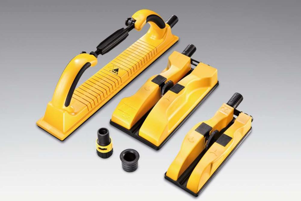 Mirka bietet als Trägerwerkzeug den mit 80 × 230 mm eher grossen «Handy»-Schleifblock an. Dieser besteht aus einer ebenen Grundplatte, auf die mit Klett das Schleifmittel kommt. Ein grosser, gummierter Bügelgriff erlaubt eine präzise und ermüdungsfreie Handhabung. Das gilt speziell, wenn es um das Egalisieren kleiner Unebenheiten in Flächen oder das Bündigschleifen von Korpuskanten geht. Sehr praktisch ist auch die Möglichkeit, einen Staubsaugerschlauch anzuschliessen.