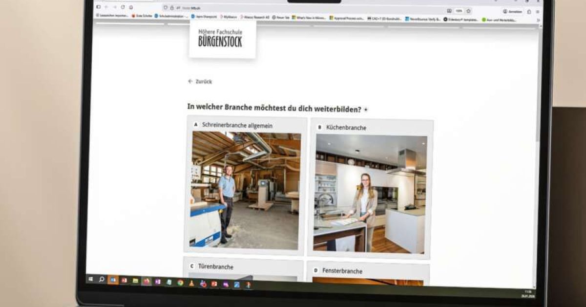 Mit der zweiten Version des Onlinetools «Weiterbildungs-Finder» baut die HF Bürgenstock ihr digitales Serviceangebot gezielt aus. Das Onlinetool unterstützt Interessierte dabei, aus dem breiten Angebot rasch und strukturiert passende Weiterbildungen zu finden. Dabei gleicht die Bedienung einem Konfigurator eines Webshops. Der «Finder» führt Schritt für Schritt durch wenige, klar formulierte Fragen. Im Zentrum steht dabei in der aktualisierten Version nicht nur der gewünschte Umfang der Weiterbildung, sondern neu auch die berufliche Ausrichtung. Das Tool überzeugt durch seine klare Differenzierung nach Branchen. So können Nutzerinnen und Nutzer gezielt angeben, ob sie eine allgemein schreinerspezifische Weiterbildung suchen oder sich in einem spezialisierten Bereich wie Küche, Fenster, Türen oder Sicherheit vertiefen möchten. Passende Angebote umfassen auch Weiterbildungen, die die HF Bürgenstock gemeinsam mit branchennahen Fachverbänden wie Küche Schweiz, dem Fachverband Fenster- und Fassadenbranche (FFF), dem Verband Schweizerische Türenbranche (VST) oder Sicheres Wohnen Schweiz (SWS) entwickelt hat beziehungsweise durchführt. Der «Weiterbildungs-Finder» richtet sich sowohl an Fachpersonen am Anfang ihrer Weiterbildungslaufbahn wie auch an erfahrene Berufsleute, die gezielt den nächsten Schritt planen möchten. Das Tool ist kostenlos und direkt über die Website der HF Bürgenstock zugänglich.
