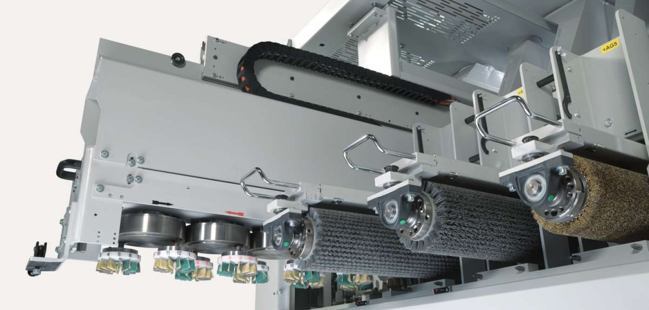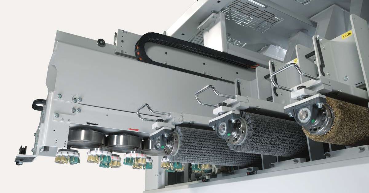 Bei Weber-Schleifautomaten kann mit der Breitbandstation der «Weber Wellenschliff» gemacht werden. Hierzu wird mit einem speziellen Schleifprogramm die irregulär geformte Oberfläche aufgebracht. Falls notwendig, können diese Flächen zusätzlich strukturiert oder säge- rau bearbeitet werden. Ein feines Finish und damit eine optimale Vorbereitung für das Ölen oder Lackieren erreicht man anschliessend durch das Bürsten mit dem «Weber Planetenkopf».