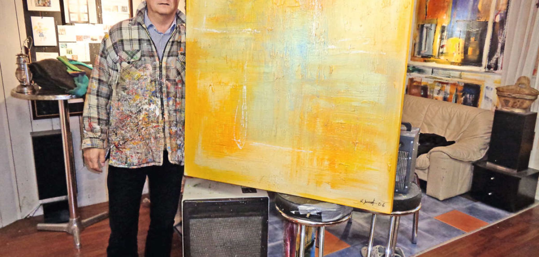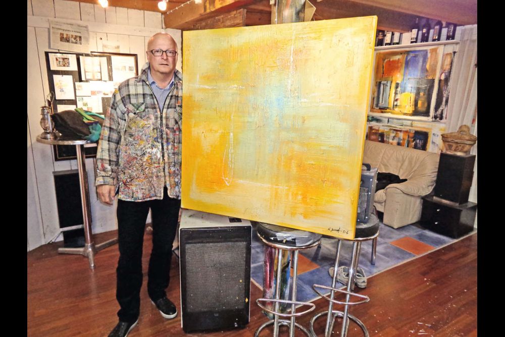 Kurt Imgrüth (53), gelernter Möbelschreiner, in seinem Atelier mit einem seiner abstrakten Werke. Bild: Fredy Blättler