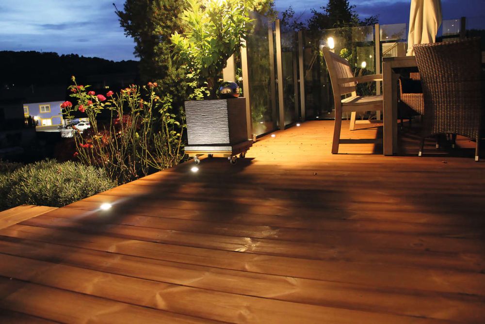 Die Möglichkeit, bei der Holzbestellung die Leuchtmittel gerade mitzubestellen, eröffnet einen weiteren Spielraum. So kann sich der Schreiner beim Kunden profilieren und sein Werk gerade mit der passenden Beleuchtung anbieten. Denn die meisten Hauseigentümer lassen früher oder später eine Aussenbeleuchtung fachmännisch nachrüsten oder decken sich später selbst im Baumarkt ein. Ähnlich wie im Küchenbau kann mit Lichtspots das moderne Ambiente eines Terrassendecks unterstrichen oder mit Stimmungslichtern eine dunkle Ecke oder ein Absatz im Deck hervorgehoben werden.