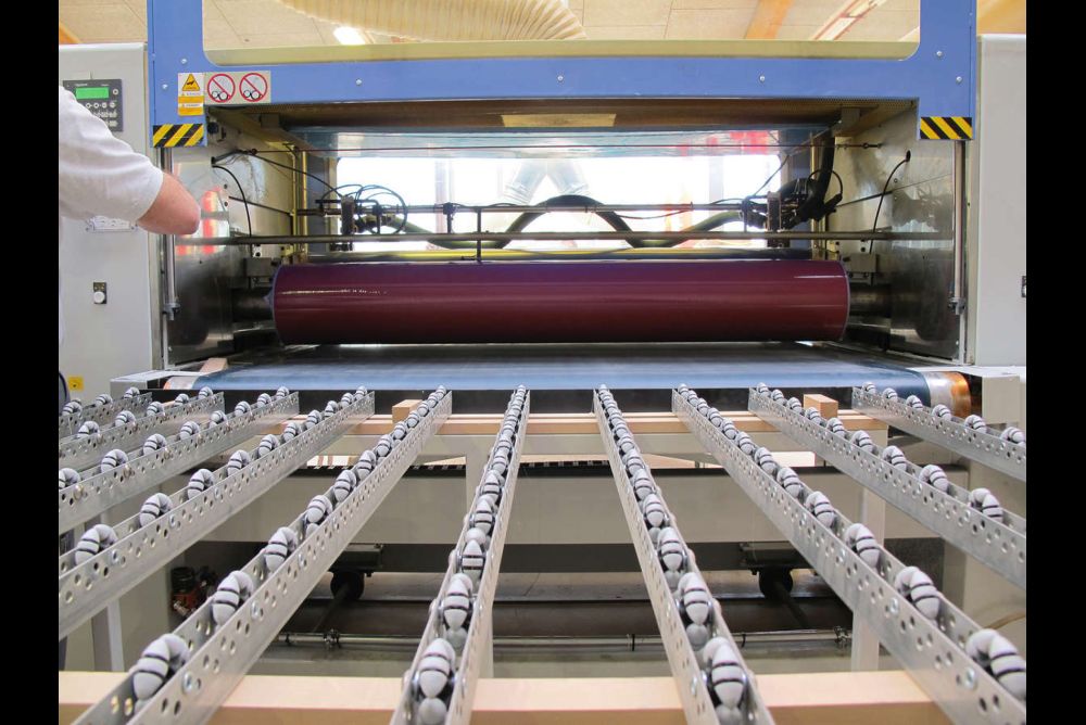 Einmal leicht mit der Hand über die Fläche gestrichen und ein Verrutschen kann ausgeschlossen werden. Mit fünf Metern pro Minute Vorschub läuft die belegte Platte durch das zweite Herzstück der Anlage, den Kalander. Dabei presst eine Gummiwalze den Belagwerkstoff auf das Trägermaterial. «Durch den kurzen Pressdruck ergibt sich eine hohe Anfangsfestigkeit, die dann über die chemische Reaktion weiter aushärtet», so Fischer. Die fertigen Platten lassen sich sofort stapeln. Am darauffolgenden Tag können die Teile dann weiterverarbeitet werden.