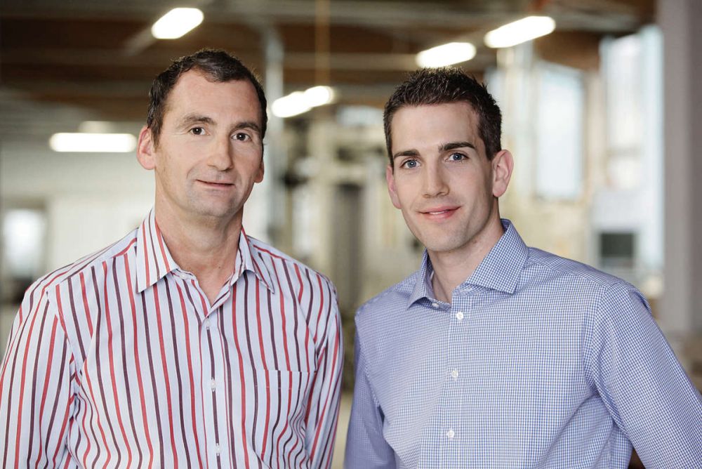 Stephan Wettstein (r.) und Urs Fischer sind dem Fortschritt mit Tradition im 1946 gegründeten Unternehmen ver- pflichtet. Mit der Flächenverleimung mittels PU-Hotmelt hat man sich neue Möglichkeiten erschlossen. Bereits 90 % aller Beschichtungn werden so heute nur noch einseitig ausgeführt. Mit den beiden Betätigungsfeldern «elements» und «unic» fertigt die Wettstein AG sowohl eigene Produktreihen mit namhaften Desigern als auch Teile als Zulieferer für Geschäftskunden und bietet das Belegen jeglicher Materialkombinationen auch den Schreinerkollegen an. Das Begreifen und Vermitteln der neuen Möglichkeiten durch das PU-Hotmelt-Verfahren sehen beide als grosse Herausforderung an.