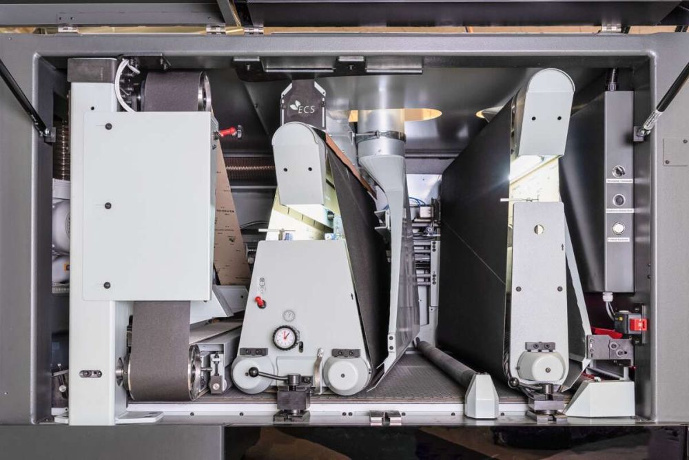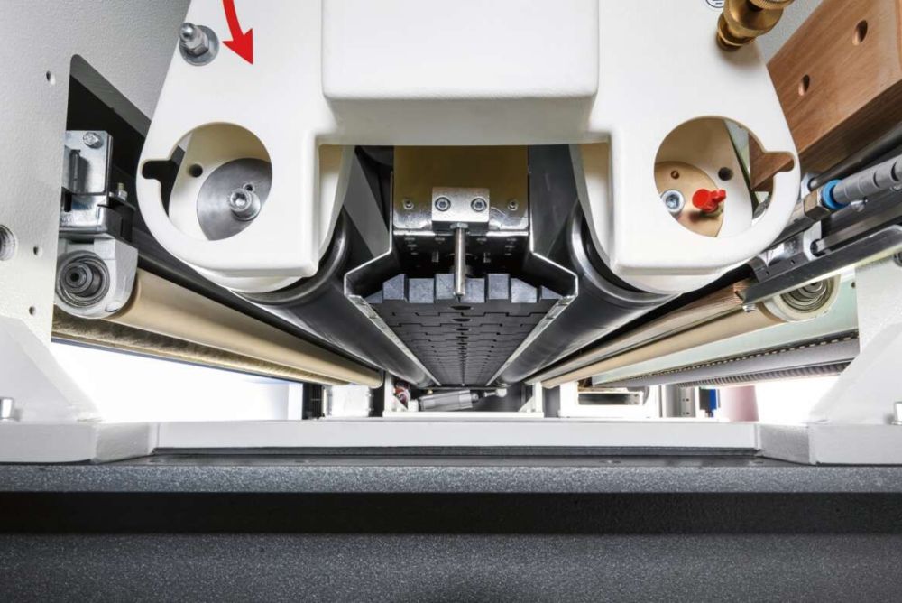 Um nur auf Kontakt eine bestehende Oberfläche schleifen zu können, muss das Schleifband um zwei Walzen laufen und mit einem Druckbalken dazwischen aufgedrückt werden. Die Maschinen von Heesemann, die von der Homag Schweiz AG in Höri ZH vertrieben werden, bieten spezielle Magnetdruckbalken mit der Bezeichnung «CSD» an. Deren Segmente sind laut Hersteller derart sensibel gesteuert, dass Furniere selbst im Randbereich nicht durchgeschliffen werden können.