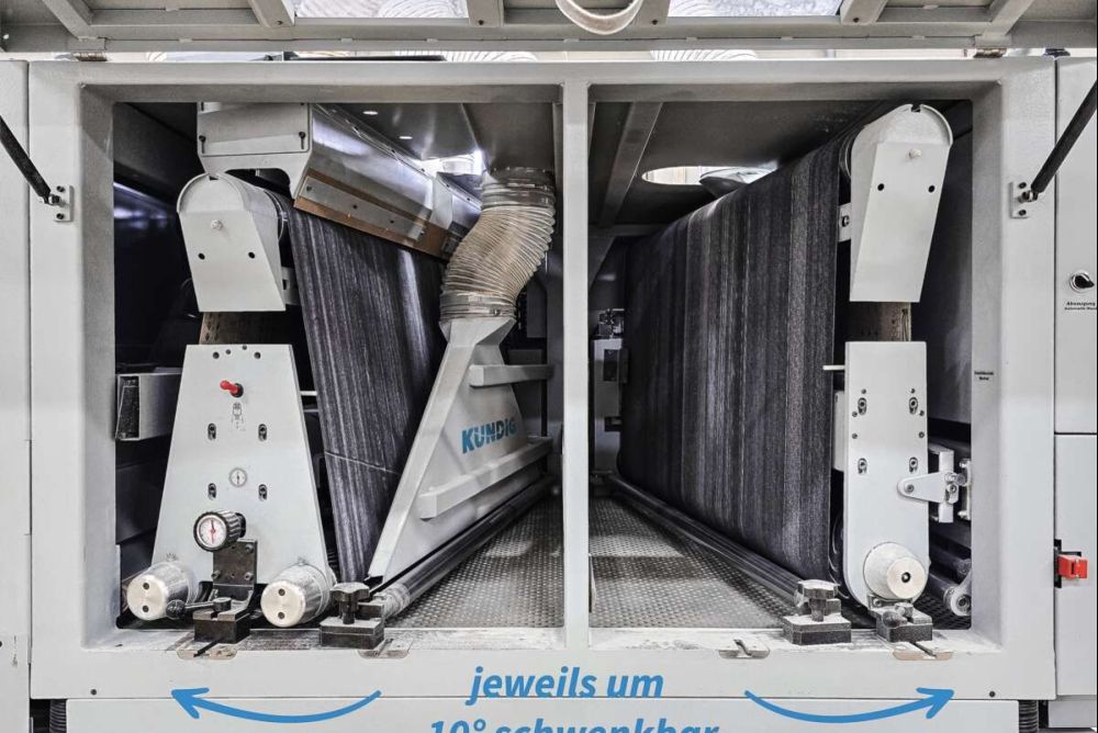 Durch die Bandoszillation kommen Fehlstellen vom Schleifband nicht am gleichen Ort vorbei, es kann sich aber eine wellenförmige Spur auf der Holzplatte ergeben. Die Kündig AG aus Wetzikon ZH hat gegen das Aufkommen jeglicher Spuren die Technologie «Brillant» entwickelt. Dabei lassen sich Schleifschuhaggregate wie auch Kalibrierwalzen um zehn Grad schwenken, sodass sie nicht mehr in die Durchlaufrichtung schleifen. Eine wellenförmige Spur wird damit unmittelbar aufgehoben.