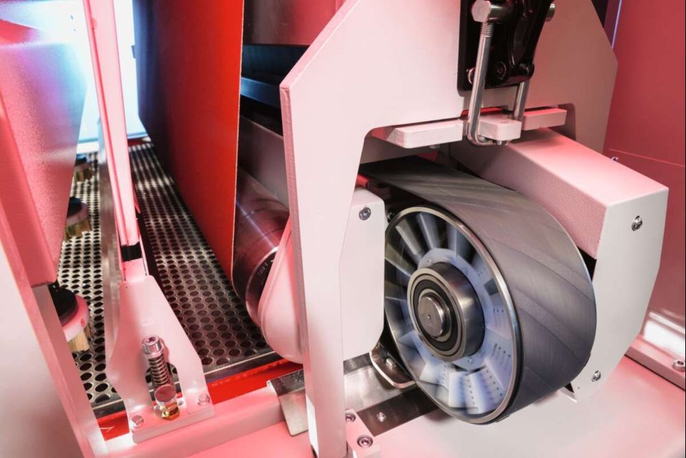 Um eine ganz andere Schleifmethode handelt es sich beim Tellerbürstenaggregat, wie dem «DB-S» von Heesemann. Es ist mit fünf Satelliten mit jeweils zwei Tellern ausgestattet, deren Drehrichtung und -geschwindigkeit unabhängig voneinander eingestellt werden können. Die Teller lassen sich mit verschiedenen Bürsten, Schleifpads oder Schleifstrips ausrüsten. Letztere erlauben auch das Schleifen von Konturen sowie Profilen und nutzen sich nur langsam über ihre Lamellenlänge ab.