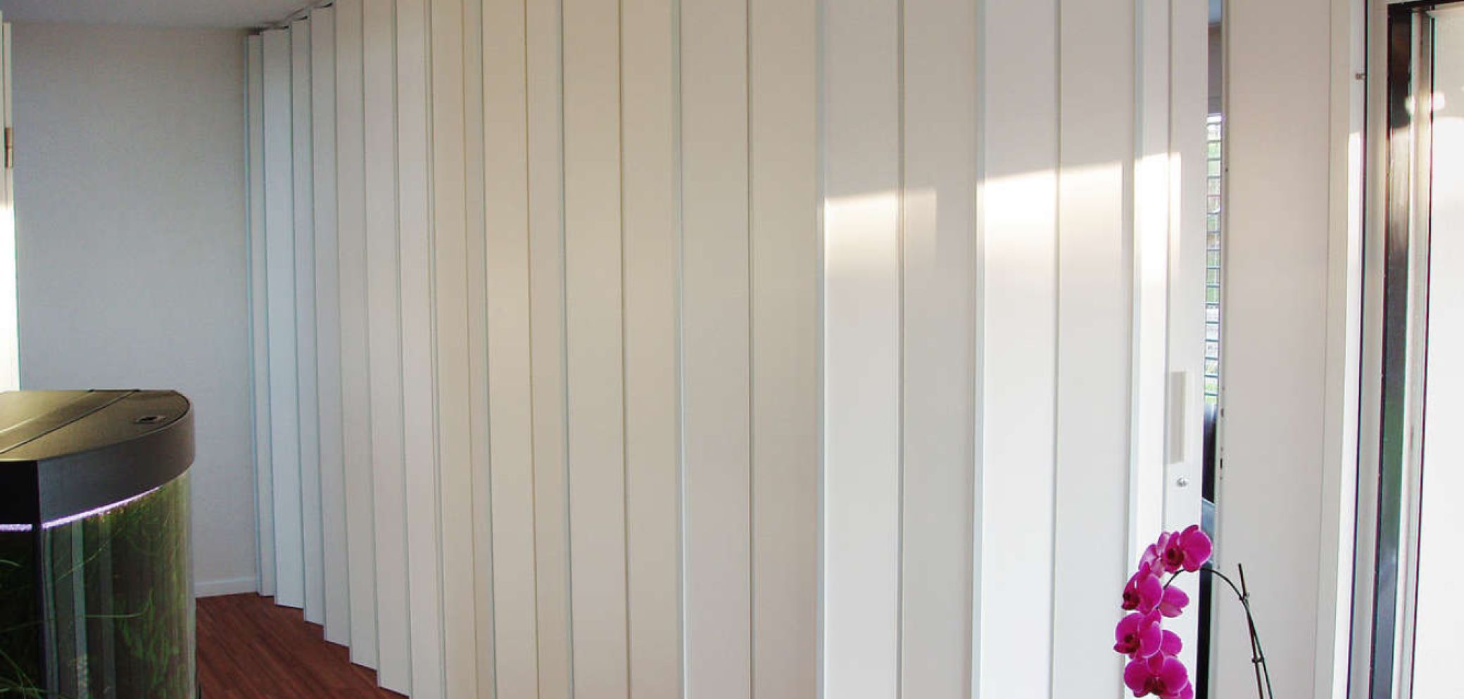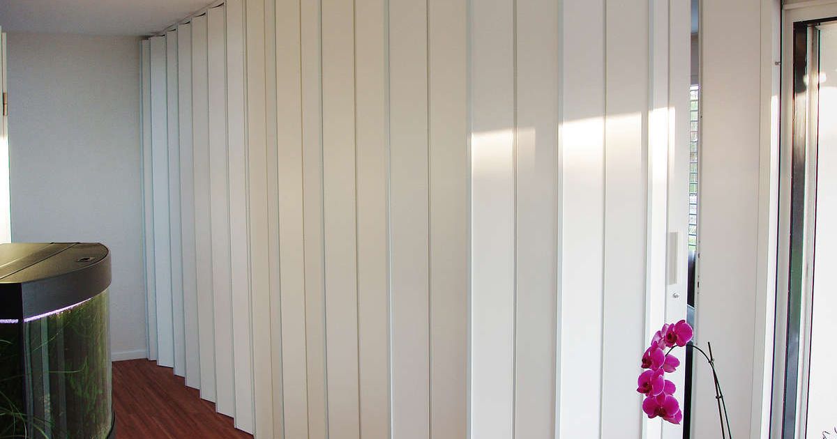 Faltwände. Wände, die sich beim Aufschieben zusammenfalten, brauchen weniger Platz als eine gewöhnliche Drehflügeltür, und sie lassen sich dennoch sehr leicht bedienen. Damit können auch recht grosse Räume unterteilt und Räume in Räumen geschaffen werden.