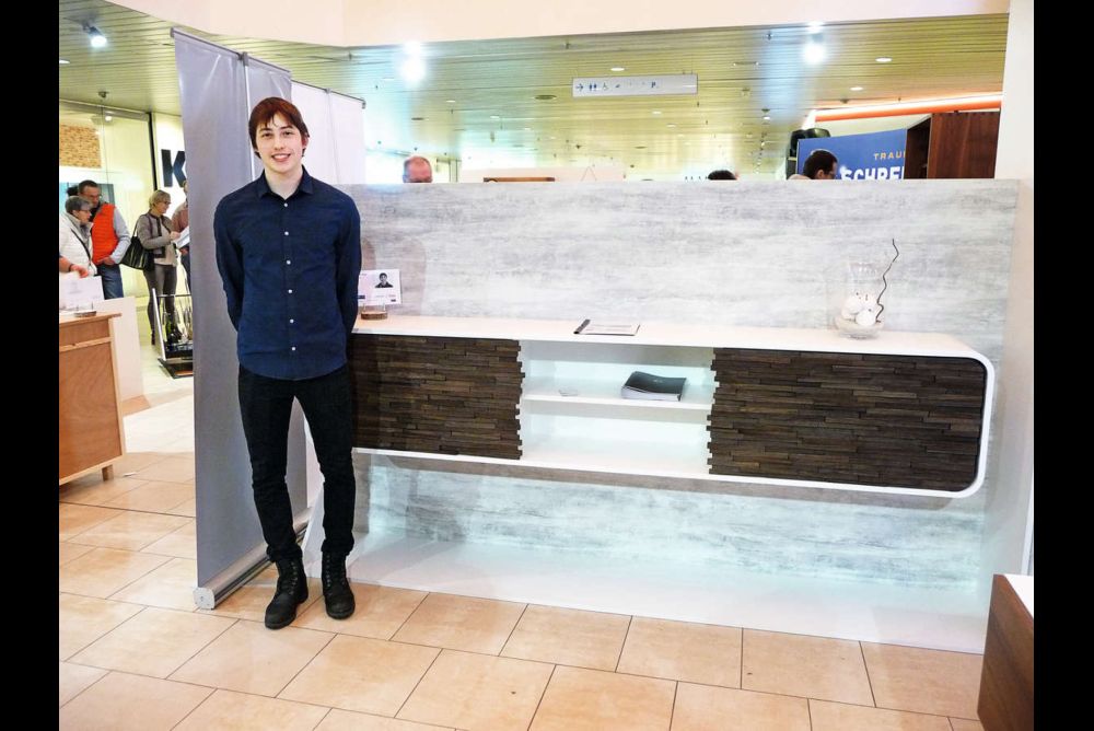 Thomas Jäger aus Goldau hat mit seinem Sideboard den Schwyzer Lehrlingswettbewerb gewonnen. «Mein Möbel verfügt über einen weissen Rahmen mit abgerundeten Ecken. Die Front besteht aus zwei schwarzen Schiebetüren, auf denen ich grobes Spaltholz aus Räuchereiche befestigt habe. Die Holzstösse der beiden Türen greifen beim Schliessen ineinander», erzählt der glückliche Gewinner. Rund 200 Stunden hat der 19-jährige Schreinerlernende, der bei der Schreinerei Lindauer AG in Steinen sein viertes Lehrjahr absolviert, in sein Möbel gesteckt. Gezeichnet und geplant wurde in der Schule, die Umsetzung erfolgte in der Freizeit. Thomas investierte dafür einige Wochenenden und über Weihnachten und Neujahr auch ein paar Ferientage. «Mein Lehrbetrieb hat mir die Werkzeuge und das Material gratis zur Verfügung gestellt und mich auch sonst stark unterstützt, dafür bin ich sehr dankbar.» Tief beeindruckt vom Support der Ausbildungsbetriebe zeigte sich auch der Goldauer Berufsschullehrer Peter Bürgler: «In gewissen Betrieben hat ein grosser Teil der Belegschaft mitgeholfen, damit das Wettbewerbsmöbel rechtzeitig fertig wurde. Ein solcher Zusammenhalt ist toll.»