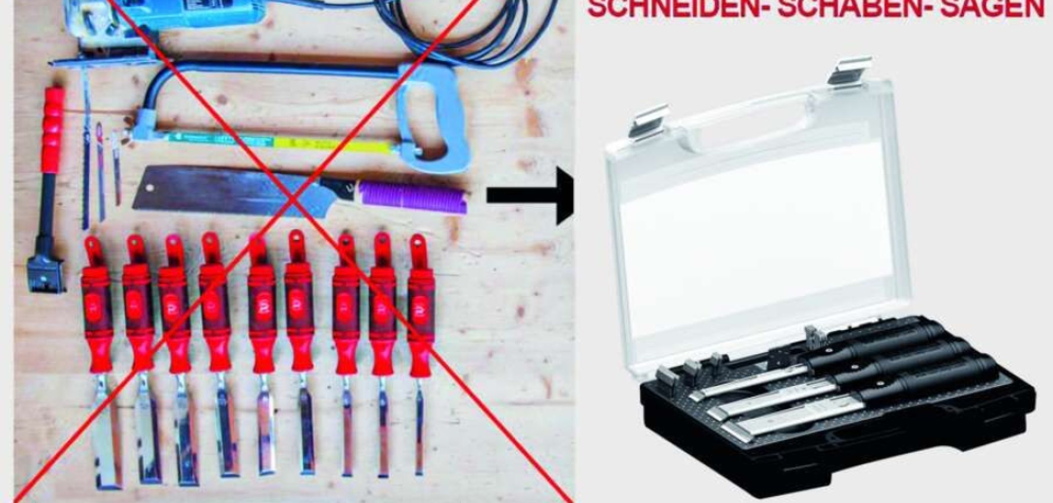 Mit dem Shark Case bietet Rali einen Koffer mit drei Multifunktions-Stechbeiteln mit austauschbaren Klingen an. Enthalten sind die neun Schnittbreiten 10, 12, 14, 18, 20, 22, 25, 30 und 40 mm sowie drei Werkzeughalter. Die Werkzeuge können wie herkömmliche Stechbeitel verwendet werden. Diese Kompaktheit spart Platz und Gewicht in der Werkzeugkiste. Ausserdem sind die Klingen immer perfekt geschliffen und einsatzbereit und der Messerwechsel ist in Sekundenschnelle erledigt. Die abnehmbaren Messer sind zudem nachschleifbar. In diesem Set sind zusätzliche Adapter enthalten, um die zwei weiteren Funktionen Schaben und Sägen hinzufügen zu können. Alles zusammen wiegt weniger als 500 g und ersetzt 13 Werkzeuge.