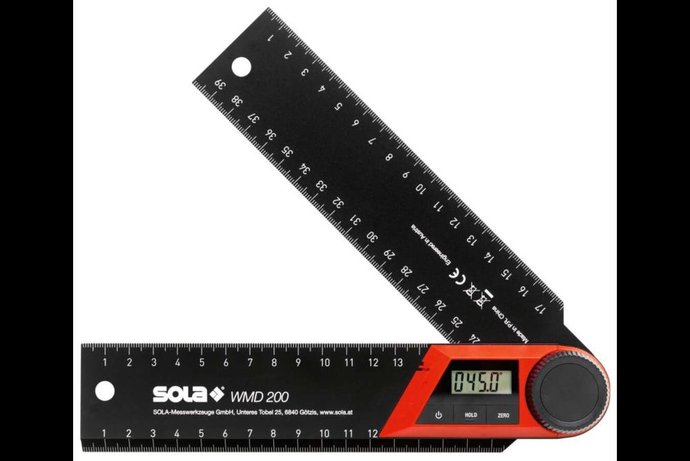Der digitale «WMD» von Sola vereint die Funktionen eines verstellbaren Winkelmessers und eines Lineals und zeigt den Messwert am Display an. Er ermöglicht ein schnelles und unkompliziertes Messen, Zeichnen und Übertragen von Aussen- und Innenwinkeln und liefert dabei präzise Messergebnisse mit einer Genauigkeit von ±0,3°. Der Winkelmesser ist in zwei Längen verfügbar: