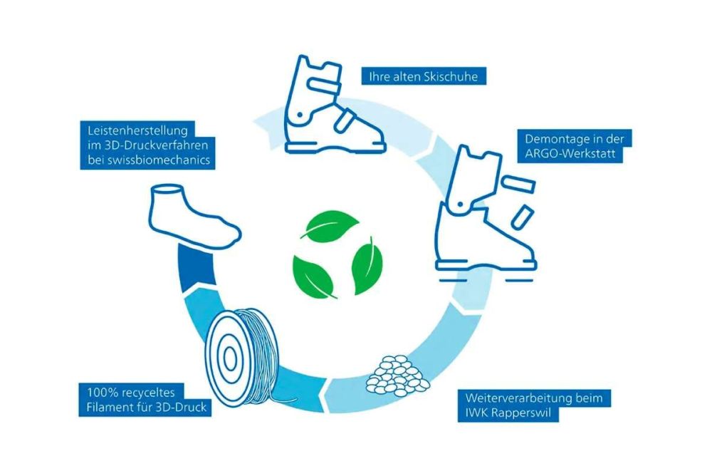 Der individuelle Schuhleisten ist das Kernstück für die Anpassung eines Mass-Schuhs. Die Leisten werden im 3D-Druckverfahren als exaktes Abbild des Fusses gedruckt. Dabei hat das Traditionsunternehmen mit Hauptsitz in Einsiedeln SZ eine ungewöhnliche Lösung gefunden: Denn das Filament für den 3D-Druck besteht zu 100 Prozent aus recycelten Skischuhen. Die alten Skischuhe werden in der Argo-Werkstatt in Davos GR von beeinträchtigten Menschen demontiert und in kleine Kunststoffteile zerkleinert. «Mit diesem neuen Verfahren haben wir viel weniger Materialabfall, und die Herstellung ist zeit- und ressourcensparend», erklärt Kryenbühl. Die Weiterverarbeitung erfolgt im Institut für Werkstofftechnik und Kunststoffverarbeitung (IWK) in Rapperswil SG. Mit der Wiederverwendung der Skischuhe schliesst sich ein Kreis, denn vor gut 60 Jahren hatte Edwin Kryenbühl, der Vater der heutigen Inhaber, in Unteriberg SZ eine eigene Schumacherwerkstatt aufgemacht und mit einer Vespa die Schuhe in den umliegenden Dörfern eingesammelt, um sie zu reparieren. Drei Jahre später wurde die Werkstatt um das Schuhgeschäft erweitert – inklusive Skischuhen.