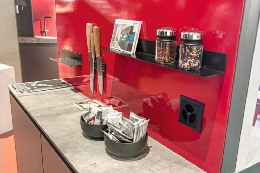 Grass zeigte mit dem lediglich acht Millimeter starken Schubladenzargen-System «Vionaro V8» eine Neuheit. Die Zargen sind komplett aus Metall gefertigt, was trotz der filigranen Anmutung eine hohe Belastbar-keit ermöglicht. So können auch grosse Fronten ohne Probleme verwirklicht werden. Die Wilhelm Schmidlin AG aus Oberarth SZ präsentierte ihre neuen Küchenrückwände aus Metall. Diese tragen mit Verklebung lediglich drei Millimeter auf und sind magnetisch. Die individuelle Farbbeschichtung ermöglicht eine passende Abstimmung mit dem Küchendesign, und preislich liegen die Metallrückwände auf dem Niveau von Glasrückwänden.