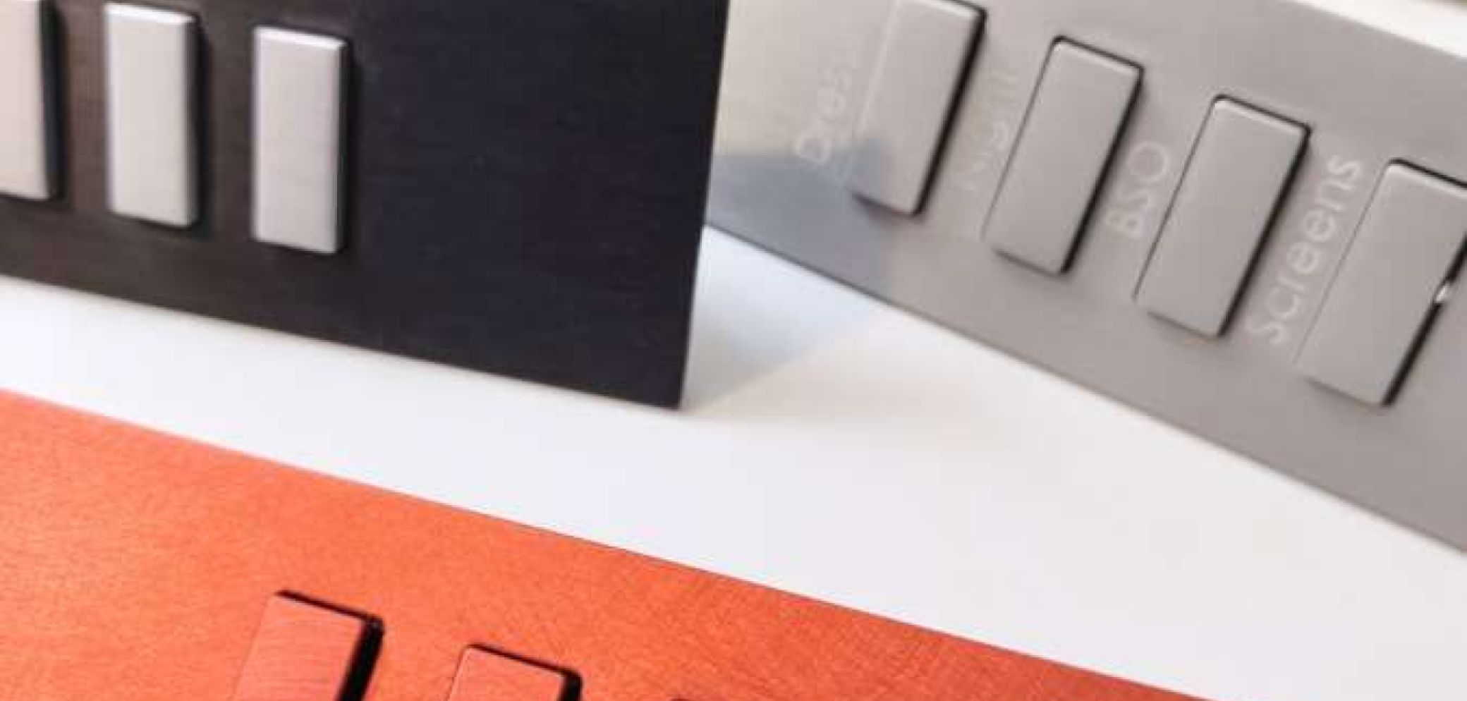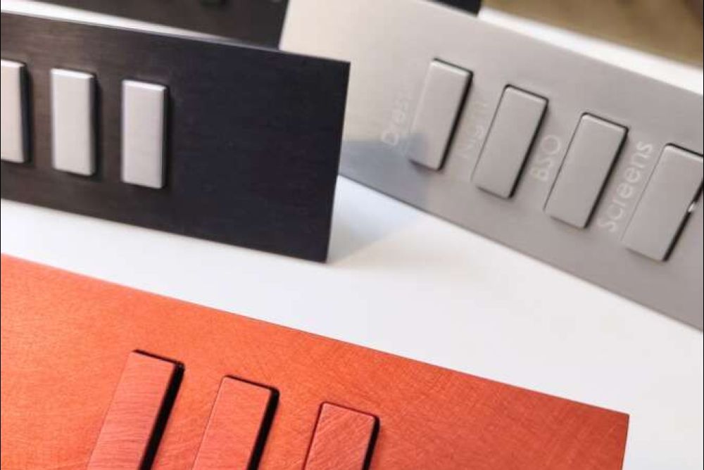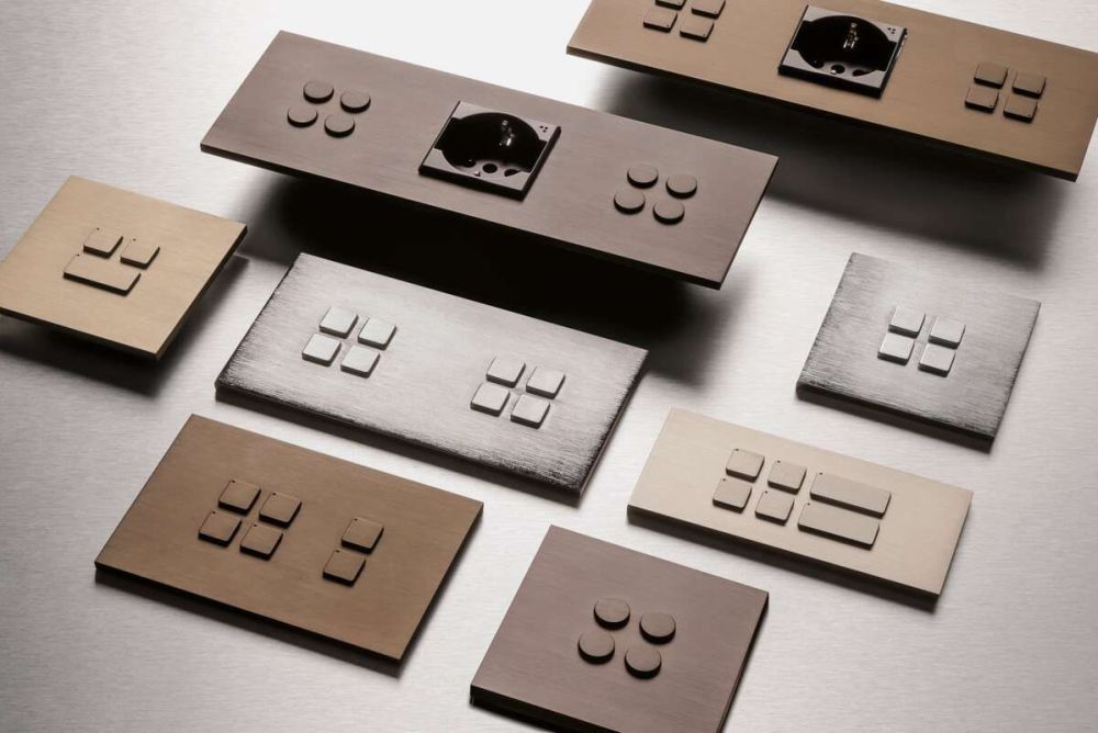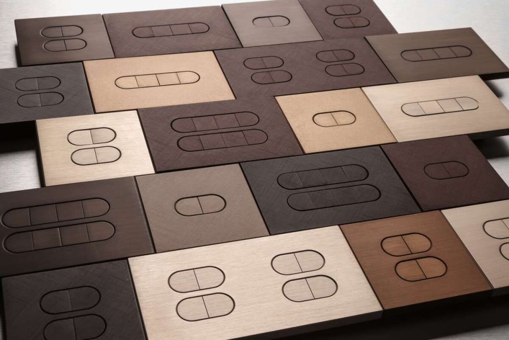 Den Oberflächen sind kaum Grenzen gesetzt. Nebst den aktuell gängigen gebürsteten oder geätzten Metallen in Bronze, Kupfer, Messing oder Stahl können die Schalter auch mit Materialien wie Alcantara, Holz, Leder oder sogar Glasmosaik belegt werden. Die Grundrahmen, die das Erscheinungsbild prägen, sind entweder aus Edelstahl, Messing oder Aluminium.