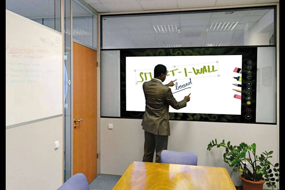 Eine zukunftsgerichtete Lösung für Büroräume ist die «Smart-i-Wall». Dabei wird ein in der Grösse frei wählbarer Teil der Glaswand zu einem Touchscreen, über welchen alle Anwendungen des PCs dargestellt werden können.