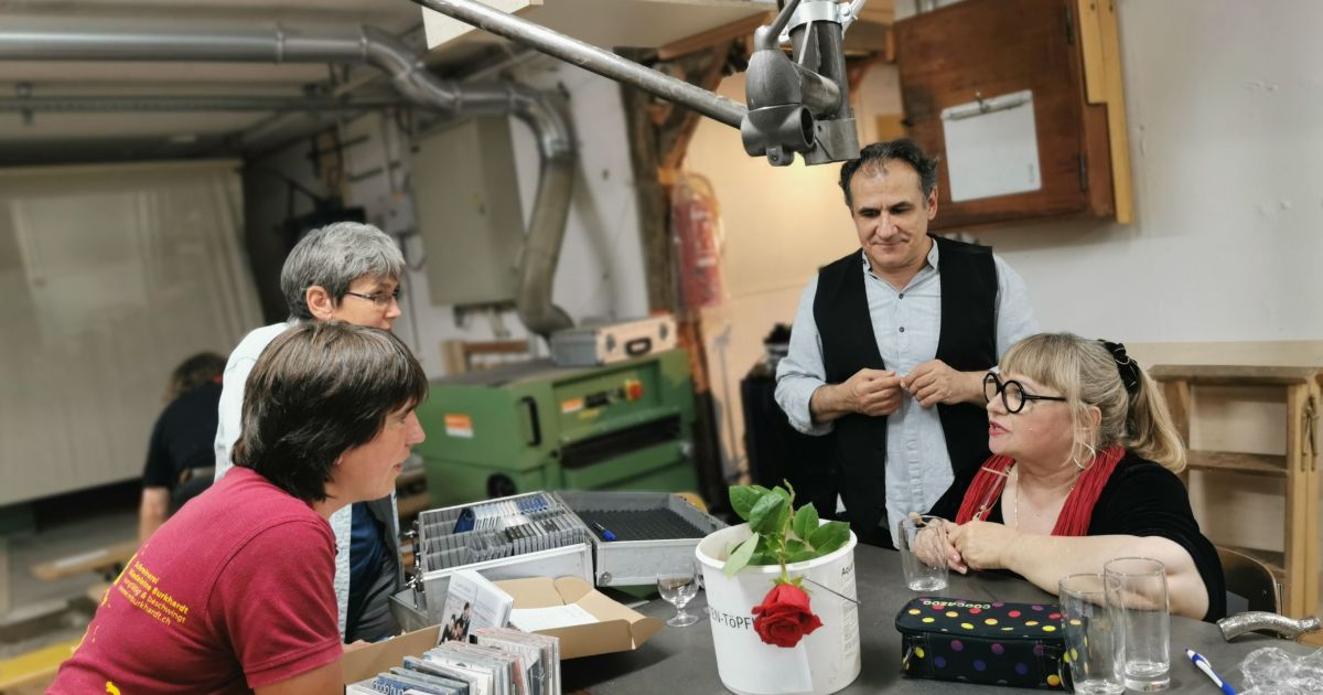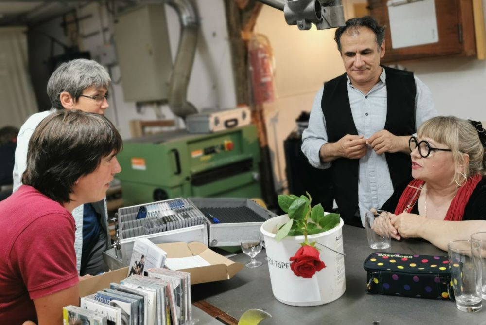 Die Kreissäge zweckentfremdet von Madeleine Burkhardt (li.) für den CD-Verkauf von Dodo Hug (re.). Dahinter Musiker Efisio Contini und Silivia Zuberbühler. Bild: Christian Härtel