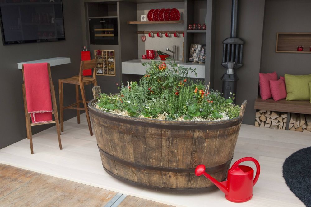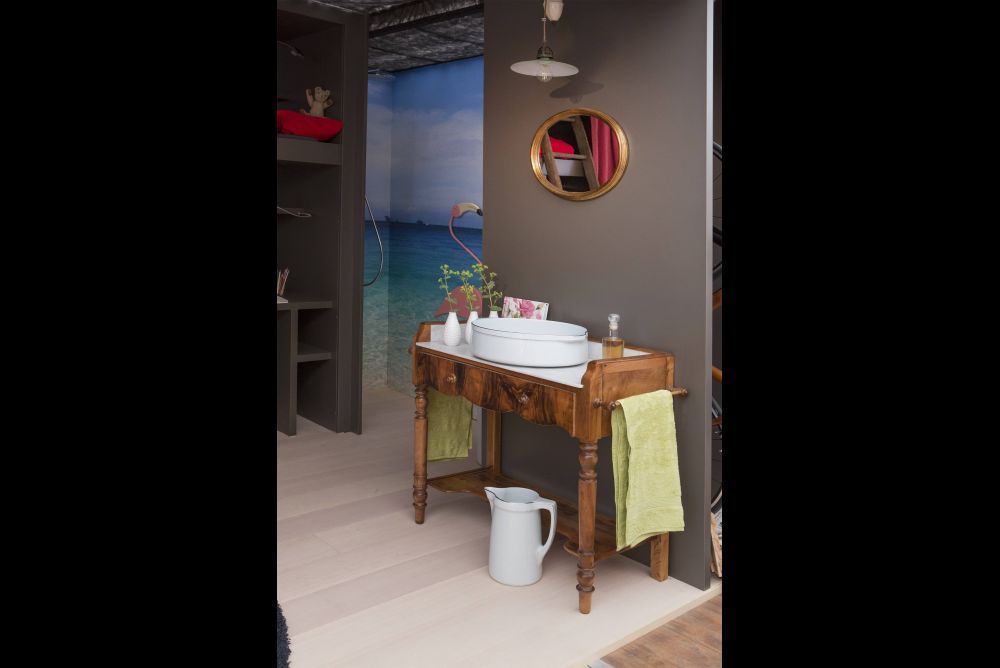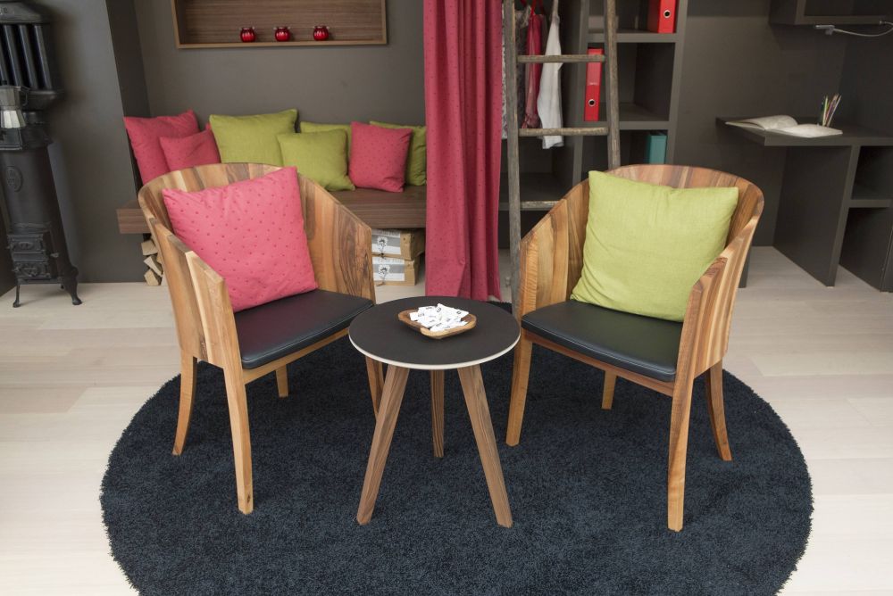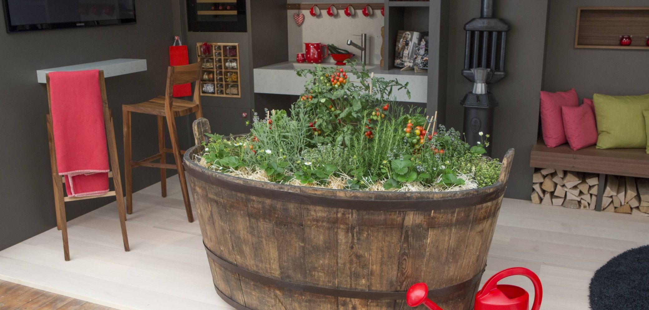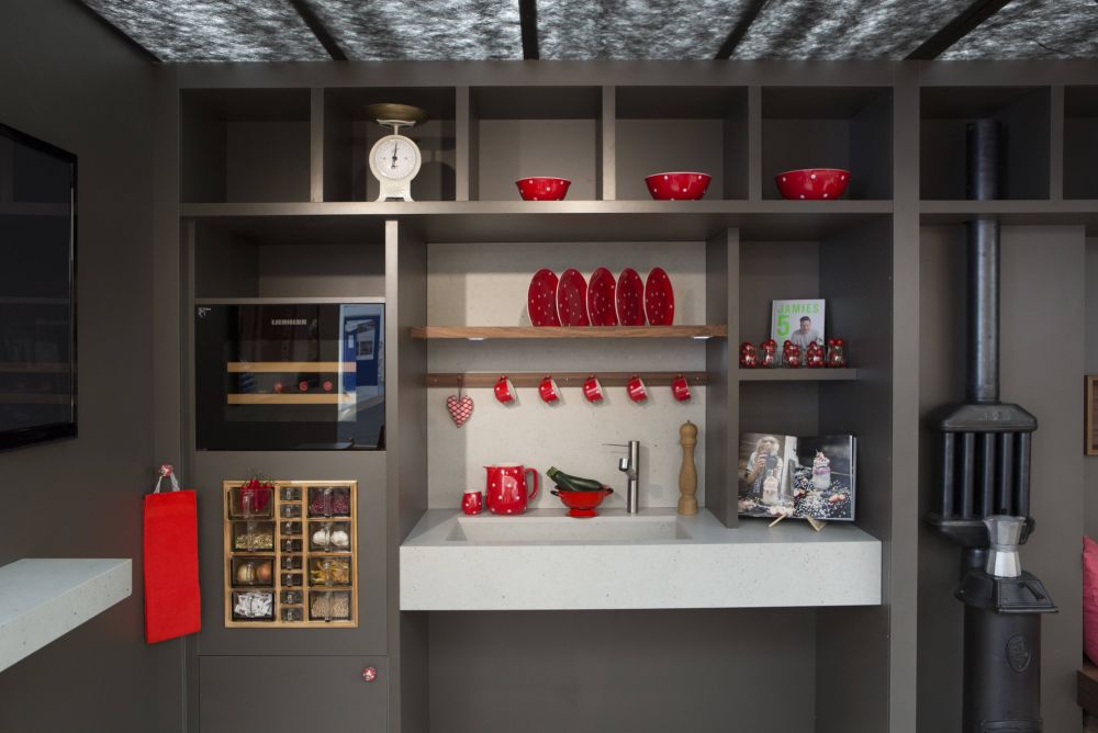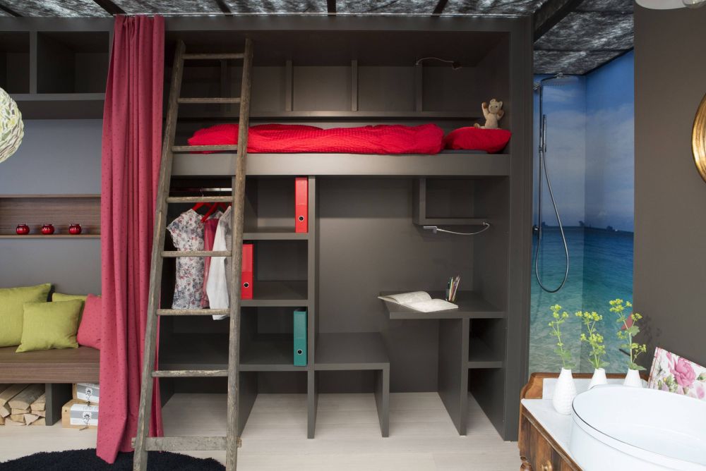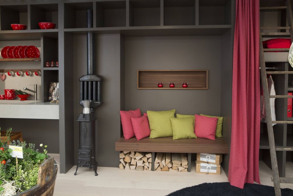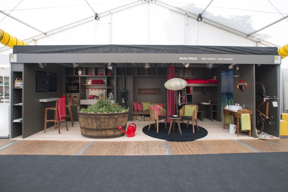Eine witzige Idee ist der Hausgarten in einem alten Holzzuber auf Rädern. In Mailand hat der Schreiner festgestellt, dass er mit seiner Idee einen kleinen Garten im Wohnraum zu platzieren sehr aktuell ist. Und auch für das Schaffen von Wohnraum auf kleinstem Raum gibt es im Fachhandel tolle Klapp-, Schiebe- und Drehbeschläge, um spannende Lösungen umzusetzen. Stefan Liechti wollte jedoch etwas Eigenes und sehr übersichtliches schaffen, wo er am Messestand nichts vorführen oder bewegen muss. Auf 8 x 3 Meter Standfläche ist alles vorhanden. Vom Küchen-, Wohn-, Bad-, über den Garagen-, Garten-, Schlaf- bis zum Bürobereich findet alles auf einfache Art und Weise seinen Platz