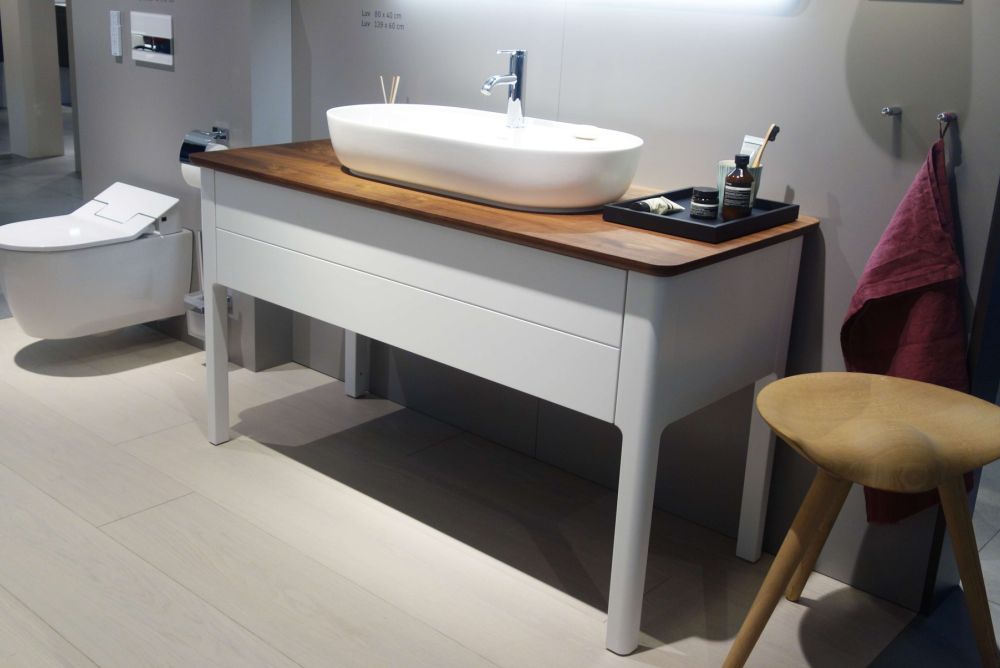 Der Waschtisch und die Lavabos unterziehen sich ebenso einem Wandel. Verbundwerkstoffe oder dünnwandige Keramik erlauben es, das Badezimmer wohnlicher zu gestalten. So ist das Badmöbel nicht mehr lieblos unter das Lavabo gestellt, sondern hat die Ästhetik einer Kommode. Aufklappbare Schminkspiegel oder ein durchdachtes Schubladeninnenleben machen zusätzlich Freude. Die Lavabos gleichen stilvollen Schüsseln, die fantasievoll in Farben, Formen und Oberflächengestaltung den persönlichen Wünschen angepasst werden.