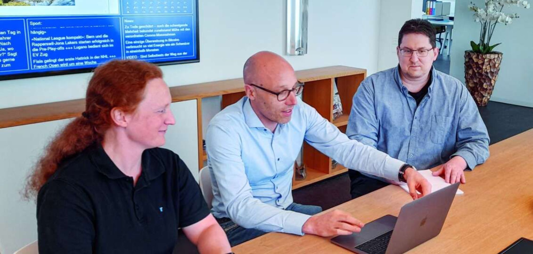 Die WPK-Verantwort-lichen Melanie Burri und Stefan Bollinger besprechen sich mit Stephan Willax (Mitte). Bild: TT Türenfabrik Turbenthal AG