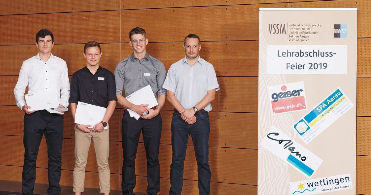 Martijn Egger (v. l.) und Mirco Baumann teilen sich mit der Note von 5,5 den zweiten Rang, Anton Flohr gelang mit der Note 5,6 der beste EFZ-Abschluss. Bild: VSSM Aargau