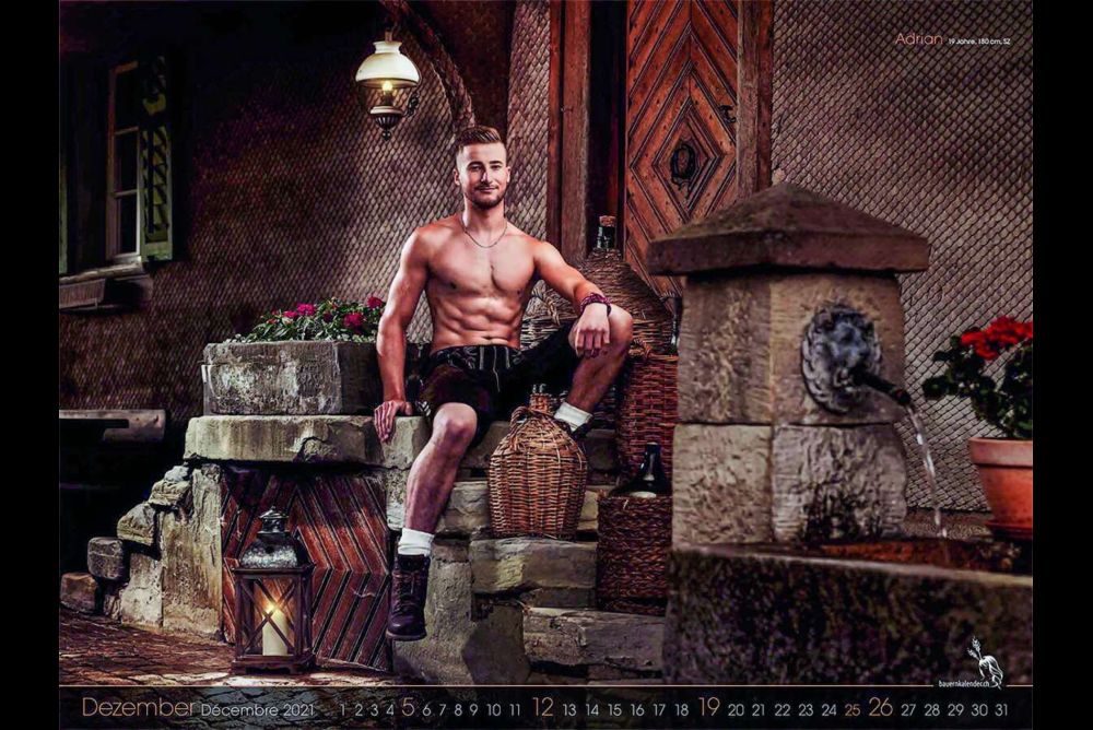 Einen Fotokalender blättert man alle 30 Tage um. Doch die Fässlers, wohnhaft auf einem Bauernhof in Altendorf im Kanton Schwyz, verharren schon seit Monaten bei Dezember 2021. Das kommt wohl daher, dass auf dieser Seite Adrian, Sohn des Hauses, höchst ansehnlich abgelichtet ist. Mit blankem Oberkörper, in Lederhosen und gestylten Haaren sitzt der junge Zimmermann auf einer Treppe vor einem Bauernhaus und guckt in die Kamera. Seine Arbeitskollegen bei der Karl Bruhin AG, Holzbau und Planungen, finden das cool, seine Grosseltern und Eltern sowieso, Hund Lucky wedelt mit dem Schwanz, sobald er sein Herrchen auf dem Foto erkennt, und fragt man Adrians Schwester Denise, so sagt diese nur: «Finde ich gut. Passt zu ihm wie die Faust aufs Auge.» Fest steht, Adrian Fässler ist für jeden Spass zu haben. So macht der 20-Jährige zur Fasnacht bei der Altendorfer Schlipfloch Clique im Gewand einer Hexe recht erfolgreich Jagd auf schöne Frauen und vertreibt so nebenbei den Winter. Eine gute Figur macht er auch als Model. So beispielsweise für das junge Schweizer Modelabel Edelvetica, welches kleidertechnisch für helvetische Gefühle sorgt. Fässlers Kumpel Valentin Pfister gründete es 2017 und führt es seither. Er war es auch, der seinem Fitness-Kollegen den Floh vom Bauernkalender-Shooting ins Ohr setzte. Ohne grosse Gegenwehr liess sich Fässler überzeugen, füllte das Anmeldeformular online aus, gab Kleider- und Schuhgrösse an und schickte ein Foto mit. Prompt lud man ihn zum Casting für die Ausgabe 2021 des Schweizer Bauernkalenders ein.