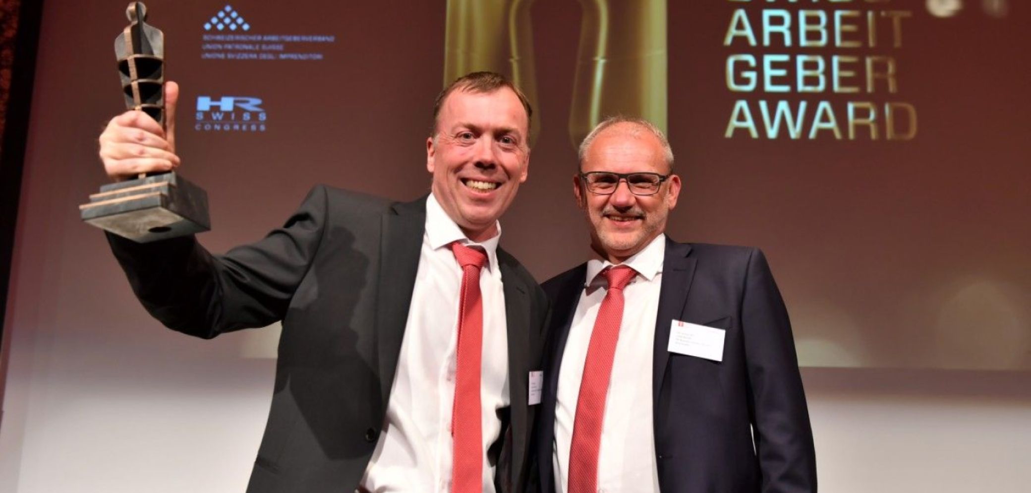 Alfred Beutler (rechts), HR Business Partner und Swen Hämmerle, Leiter Produktion, freuen sich über den 1. Platz. Bild: Swiss Arbeitgeber Award