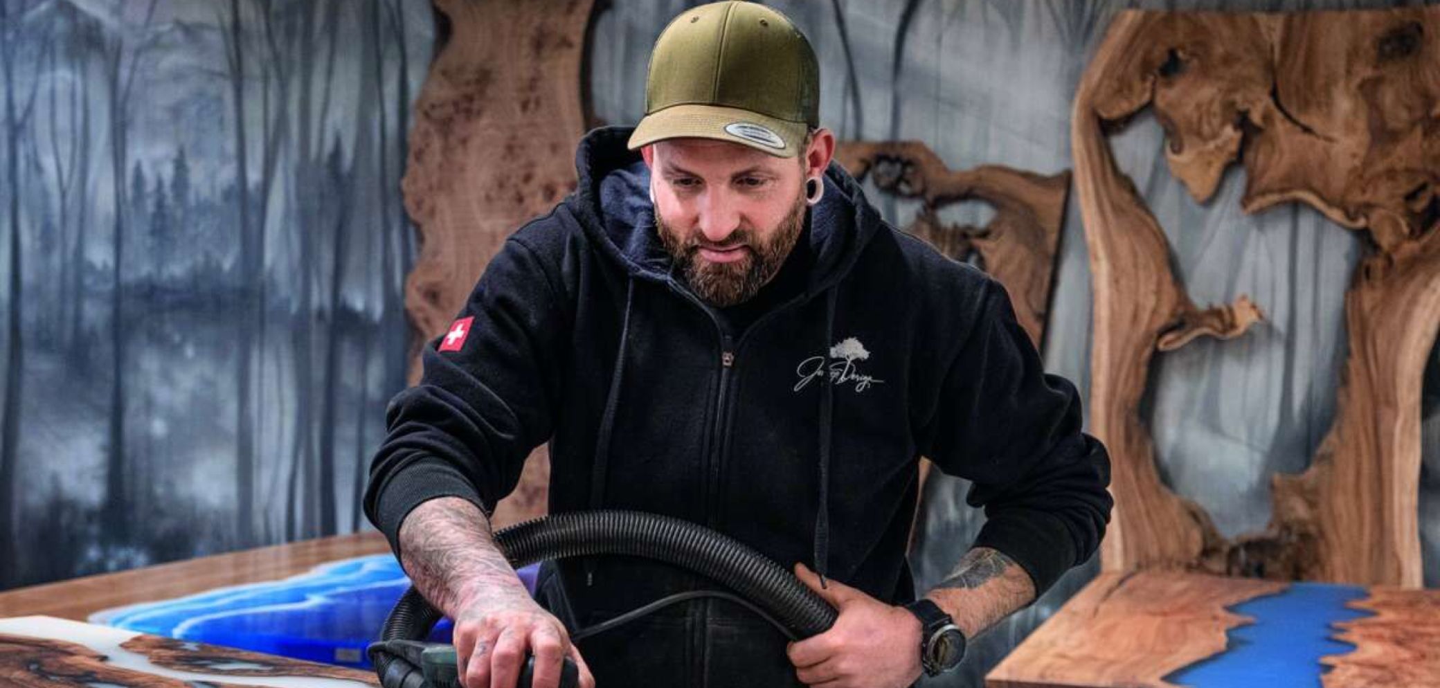 «Ich machte quasi eine Suchtverlagerung und begann zu trainieren», erzählt er. Plötzlich wog er 110 Kilos anstatt 70. Kraft und Energie brauchte er auch für seine Arbeit: «Ich war im Bühnenbau tätig und im Spezialtiefbau.» Die ganze Woche sei er unterwegs gewesen, was sehr viel Energie gekostet habe. Es folgte ein Burnout. Nachdem es wieder aufwärts ging, machte er die Lastwagenprüfung und arbeitete als Saugbaggerfahrer. Eines Tages habe er einen Tisch entdeckt, mit Epoxidharz gegossen. Dieser sei ihm nicht mehr aus dem Kopf gegangen, und er wollte der Sache nachgehen.