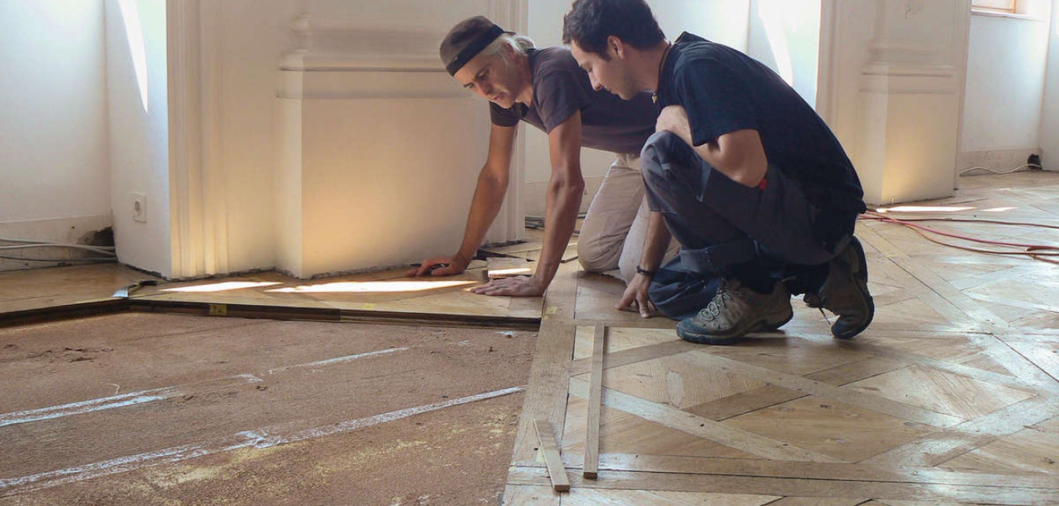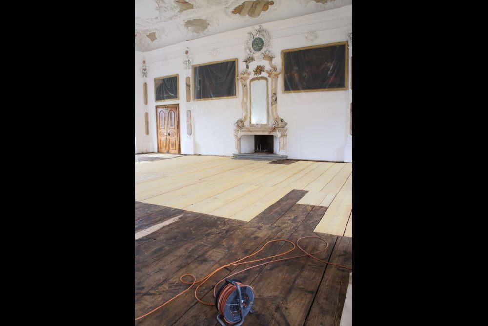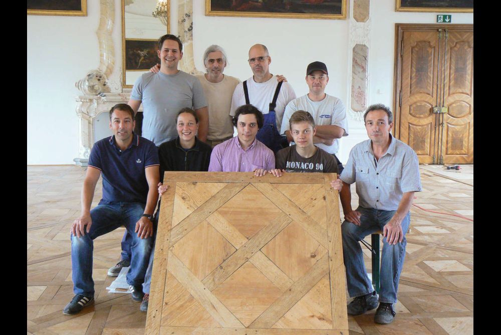 Dies betraf teils die Konstruktionsverbindungen innerhalb der masshaltigen Parketttafeln, die durchtrennte Befestigungstechnik der einzelnen Parketttafeln sowie die prägende und sehr hochwertige bauzeitliche Oberflächenbeschichtung. Die geplanten Restaurierungseingriffe führte man in den beiden Restauratorenwerkstätten aus. Dazu wurden je zwei Teams gebildet, welche an je fünf ausgewählten Parketttafeln die Eingriffe in die Substanz ausführten.