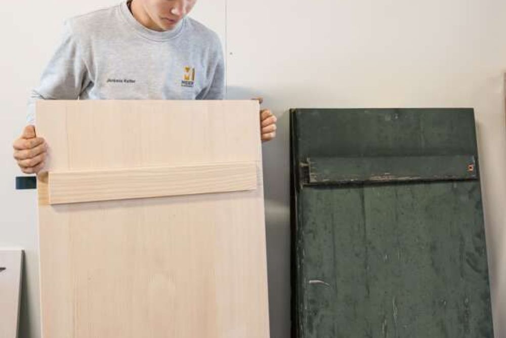 Um Schreiner zu werden, gibt es viele gute Gründe. Fragt man Berufstätige, lautet die Antwort oft: «Man sieht am Ende des Tages, was man wirklich gemacht hat» und «Die Arbeit mit Holz macht Spass». Bei Jérémie Keller ist es gleich: Mit Massivholz zu arbeiten, fasziniert ihn am Beruf. Mit 17 Jahren steht er mitten in der Lehre zum Schreiner. «Holz lebt, riecht und reagiert unterschiedlich. Im Gegensatz zum Plattenmaterial, das ich eher als Massenprodukt empfinde, bietet Massivholz viel Gestaltungsfreiheit», sagt Keller. Er lässt sich in der Meier Schreinerei AG in Weinfelden TG ausbilden und ist soeben mit der Herstellung von neuen Fensterläden aus Holz beschäftigt. Der Umgang mit dem natürlichen Werkstoff mit seiner Maserung, Farbe und seinen Details sei für ihn das eigentliche Handwerk.