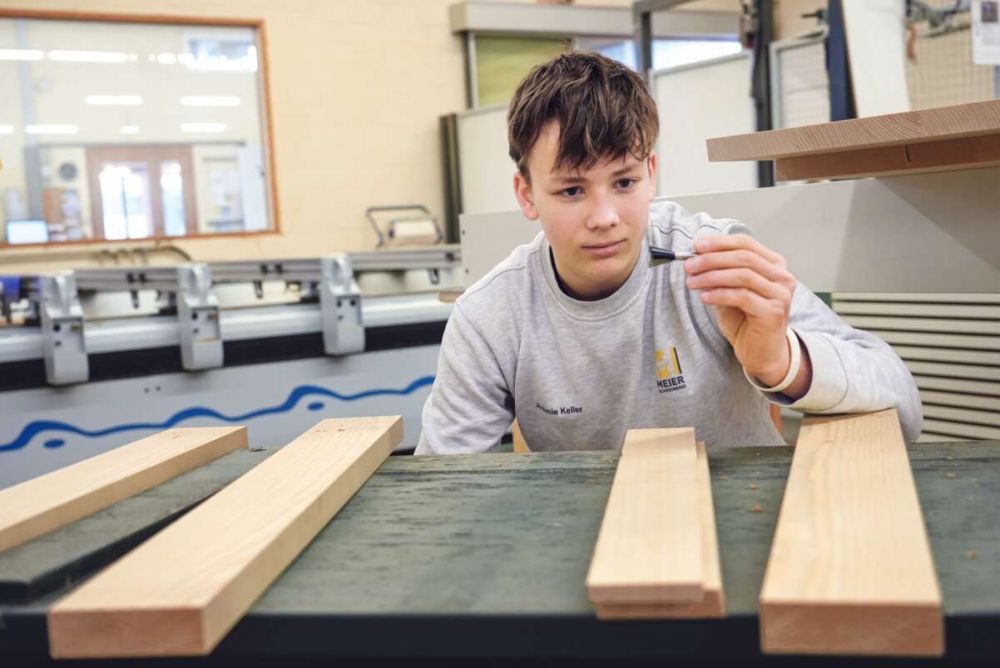 Der Weg zur Meier Schreinerei AG führte für den Lernenden im vierten Lehrjahr über mehrere Schnupperlehren. In der näheren Umgebung fand er keinen Betrieb, der passte oder eine Lehrstelle anbot. Also schaute er weiter, informierte sich über Websites und machte insgesamt fünf bis sechs Schnupperlehren. Am Ende blieben zwei Betriebe übrig. «Hier hat es mir schliesslich am besten zugesagt.» Rückblickend sagt er, dass er ohne fixe Erwartungen in die Lehre startete. «Ich habe mir vorher nicht so konkrete Vorstellungen gemacht.» Trotzdem fühlte sich der Einstieg richtig an. Er kannte den Betrieb bereits durch Schnuppern und Ferienarbeit, wusste, wie gearbeitet wird und was ihn erwartet.