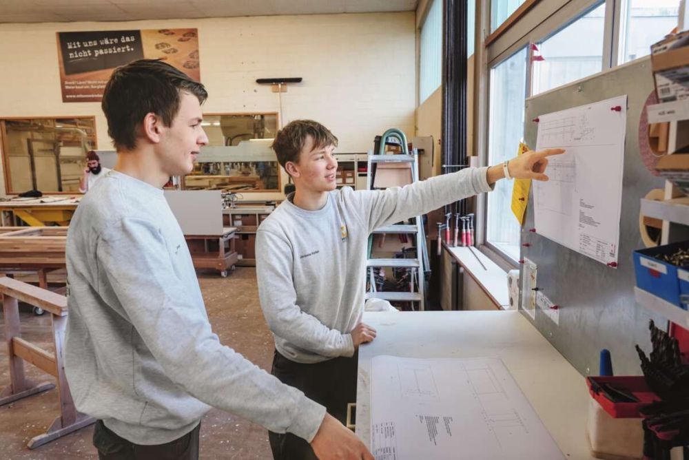 Die Lernenden Timon Moser (l.) und Jérémie Keller (r.) sind bei der Meier Schreinerei AG in der Ausbildung. Bild: Michi Läuchli