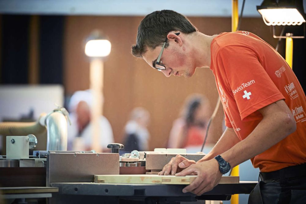 Es ist Sonntagnachmittag. Sonnenstrahlen treffen auf die Fenster der Halle Nummer 4 auf dem Bernexpo-Areal und tauchen die in die Jahre gekommene Wettkampfhalle stellenweise in grelles Licht. Im Innern hat sich nahe des Eingangs eine kleine Menschentraube aus Jung und Alt angesammelt. Stimmengemurmel mischt sich mit dem Geräusch von Hammerschlägen – Holzgeruch liegt in der Luft. Gespannt blicken die Besucher der Swiss Skills Bern auf einen jungen Mann in orangem T-Shirt. Dieser hält mit einer Hand einen Stuhl aus Eichenholz fest, mit der anderen schleift er in aller Ruhe und doch zügig und hochkonzentriert das Holz glatt.