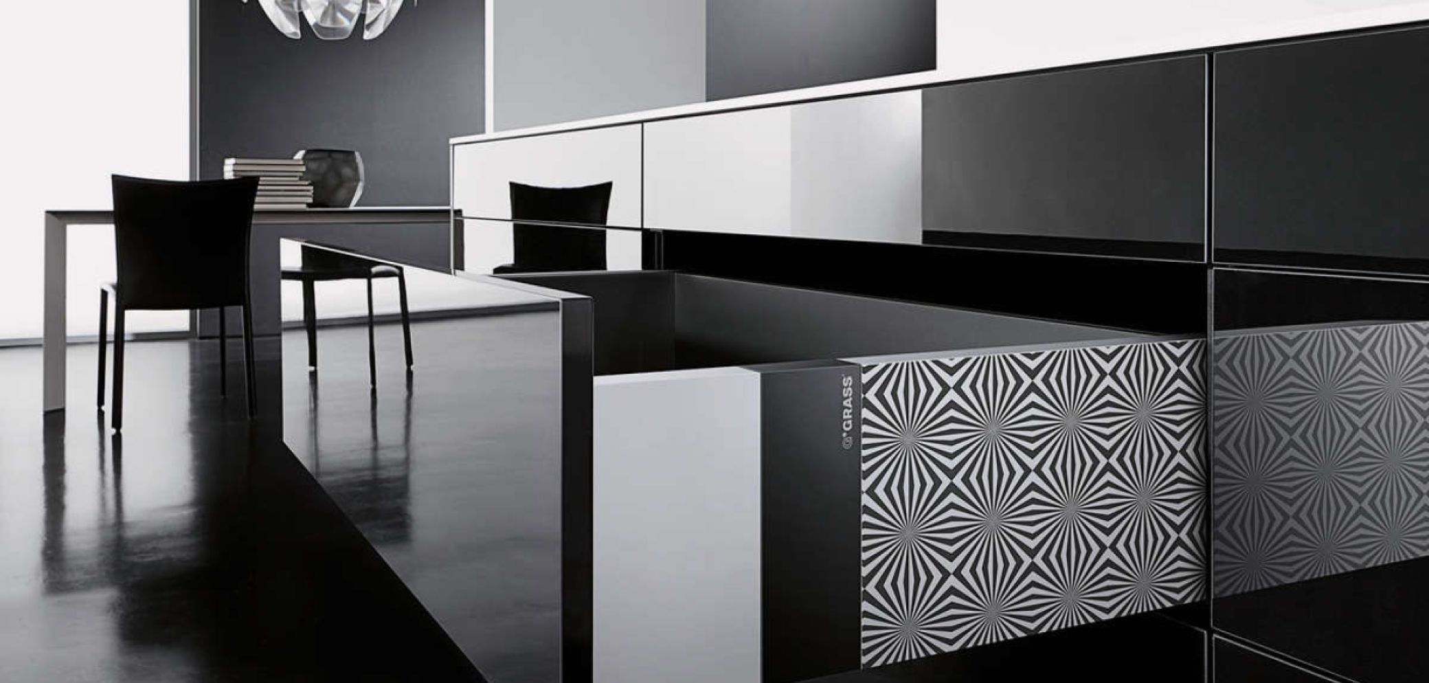 Die Standardzarge «Vionaro» von Grass kann neuerdings mit bedruckten Elementen aus Aluminium ergänzt werden und bietet somit einen neuen Gestaltungsspielraum. Dank einer Cliptechnik lassen sich die Designhüllen auch auf bereits eingebaute Zargen ohne Werkzeug aufbringen. Eine Schubladenseite kann vertikal bis zu dreimal unterbrochen werden. Die im Goldenen Schnitt unterteilte Zarge bietet mit den Dekoren somit 368 Kombinationsmöglichkeiten. Die Basiszarge aus Stahl kann in vier Farbtönen gewählt werden. Die Aluminiumelemente sind silbern eloxiert, mattschwarz lackiert und in neun grafischen Patterns wählbar. Weiter sind unterschiedliche Ornamente, Muster und Farben erhältlich, die auf die Vorlieben der jewei- ligen Länder abgestimmt sind.