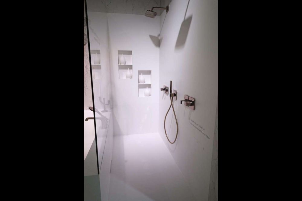 Die Armaturen sind in klaren und reduzierten Formen gestaltet. Die Duschköpfe werden immer dünner und dadurch leichter im Gewicht. Sie sind in verschiedenen Metalltönen erhältlich. Auffallend häufig waren an der Messe Armaturen in Roségold und mit matten Oberflächen zu sehen.