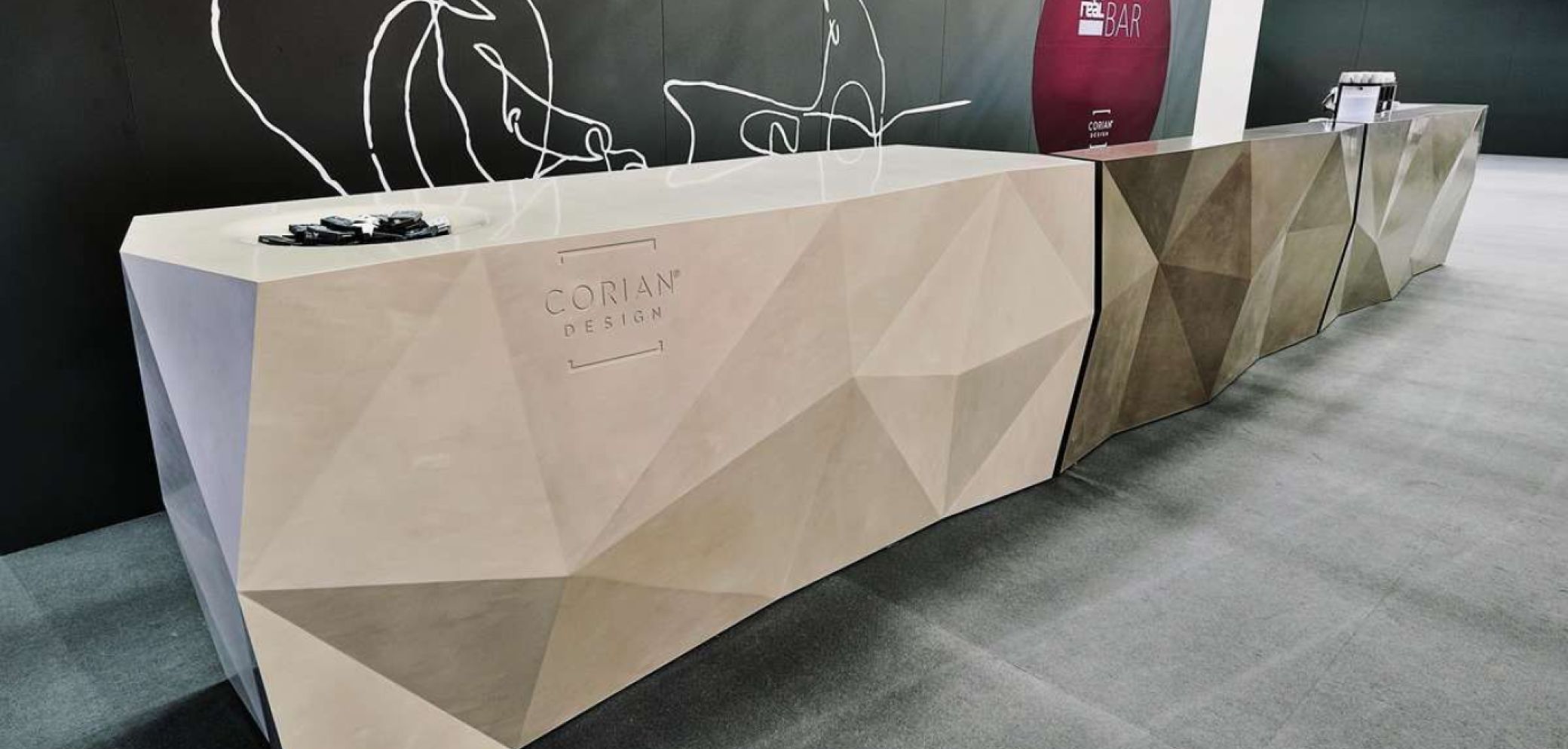 Die Moser GmbH zeigt den Besuchern an ihrem Stand die Vielfalt der Mineralwerkstoffbearbeitung in ihrer vollen Bandbreite. Zwei Thekenelemente mit Facetten-Optik in zwei unterschiedlichen «Corian»-Farbtönen bilden das Zentrum. Die Theken mit vielerlei gestalterischen Extras werden von einer dreidimensional gefrästen Wandverkleidung von 7 × 3 m Grösse eingerahmt. Aus dieser Wand ragt ein weiteres Produkt von Moser, der «Pinion-med». Das ist ein eleganter OP-Waschtisch, der beliebig verlängerbar ist und die Kompetenzen der Firma im Bereich Thermoforming aufzeigt.