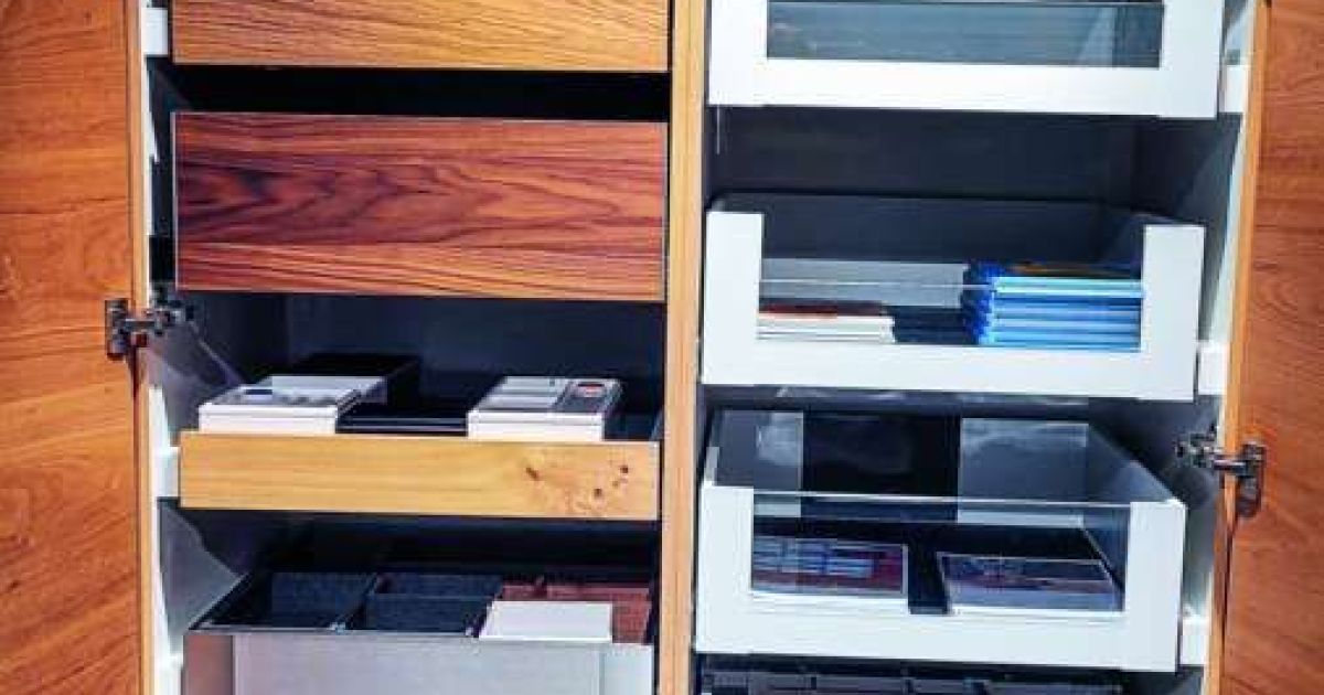 Auch Hochschränke, die als Vorratsschränke dienen, sind sinnvollerweise mit Schubladen ergänzt. In der Ausstellung der Seliner AG in Niederurnen GL präsentiert die Schreinerei ihrer Kundschaft die Vielfalt an Innenschubladen in einem Schrank. Soll dem Nutzer ein optimaler Blick in die Schublade ermöglicht werden, kann das Frontstück und auch die Seiten mit einem Glaselement ergänzt werden.