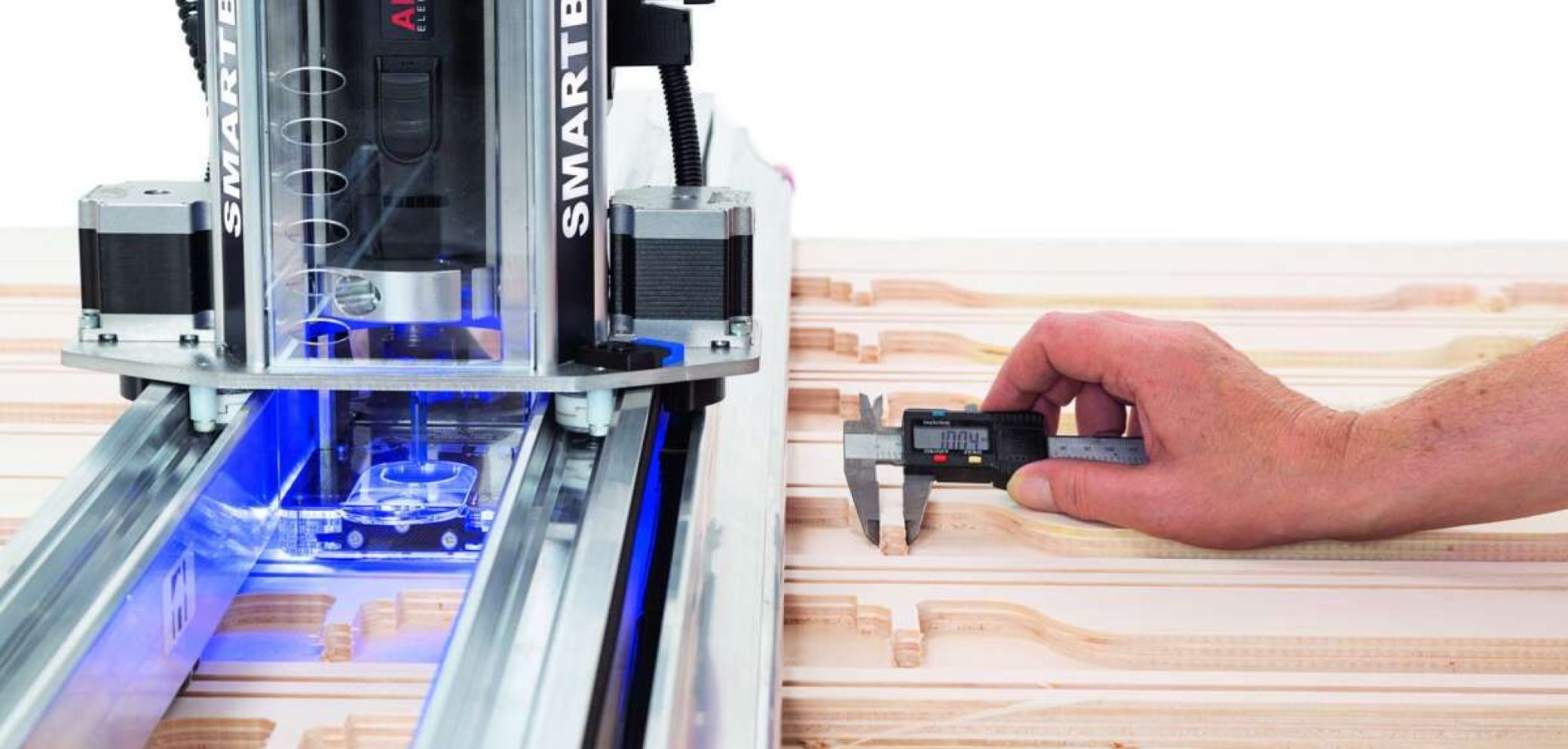 Die «Smartbench» ist durchaus auch für die Bearbeitung kleinerer, bereits formatierter Teile geeignet. Man muss dann an der Op-ferplatte entsprechende Bohrungen für Spannelemente platzieren. Dabei hilft bei der Variante «Precision Pro» der Kreuzlinienlaser für die exakte Ausrichtung. Die Drehzahl der Fräserspindel wird über die Steuerung geregelt und kann entsprechend angepasst und je nach gewünschter Arbeit hinterlegt werden.
